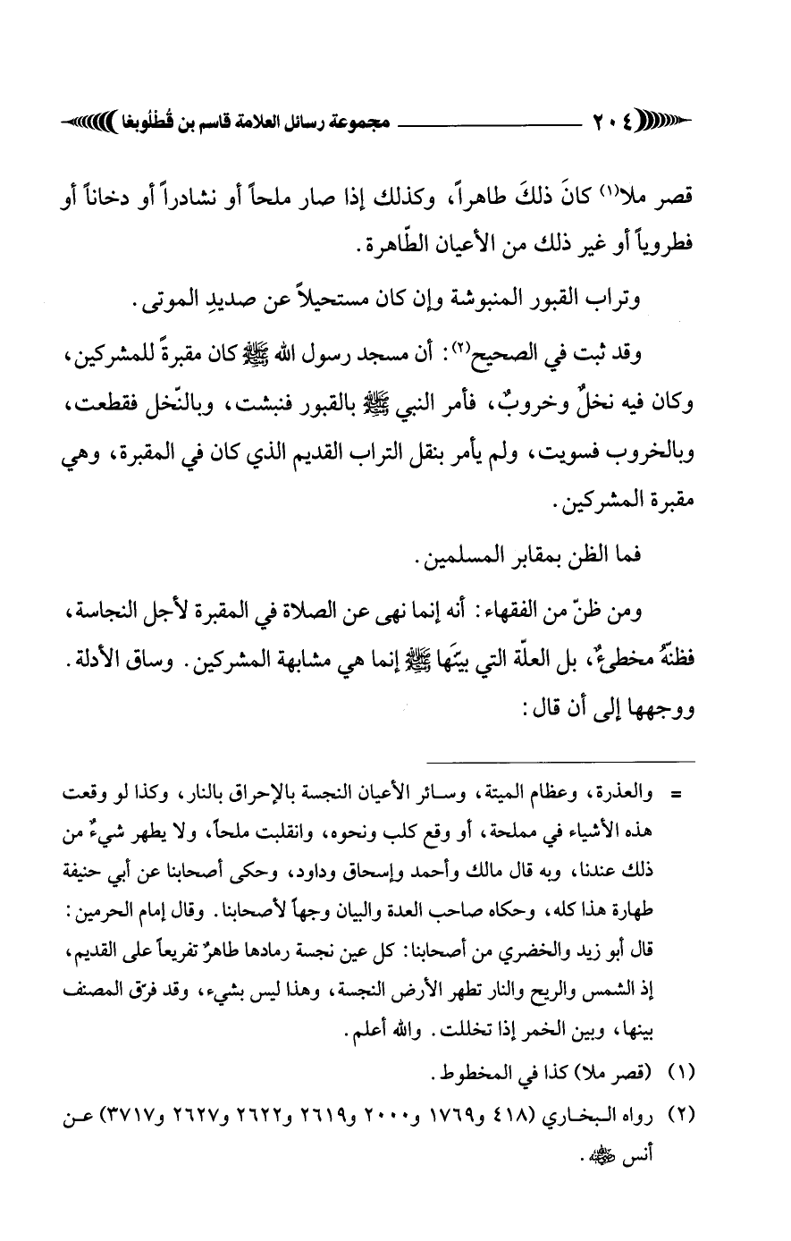 قصر ملا (¬1) كانَ ذلكَ طاهرًا، وكذلك إذا صار ملحًا أو نشادرًا أو دخانًا أو فطرويًا أو غير ذلك من الأعيان الطّاهرة.