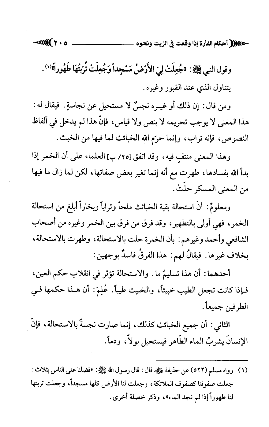 ومعلومٌ: أن استحالة بقية الخبائث ملحًا وترابًا وبخارًا أبلغ من استحالة الخمر، فهي أولى بالتطهير، وقد فرق من فرق بين الخمر وغيره من أصحاب الشافعي وأحمد وغيرهم: بأن الخمرة حلت بالاستحالة، وطهرت بالاستحالة، بخلاف غيرها.
