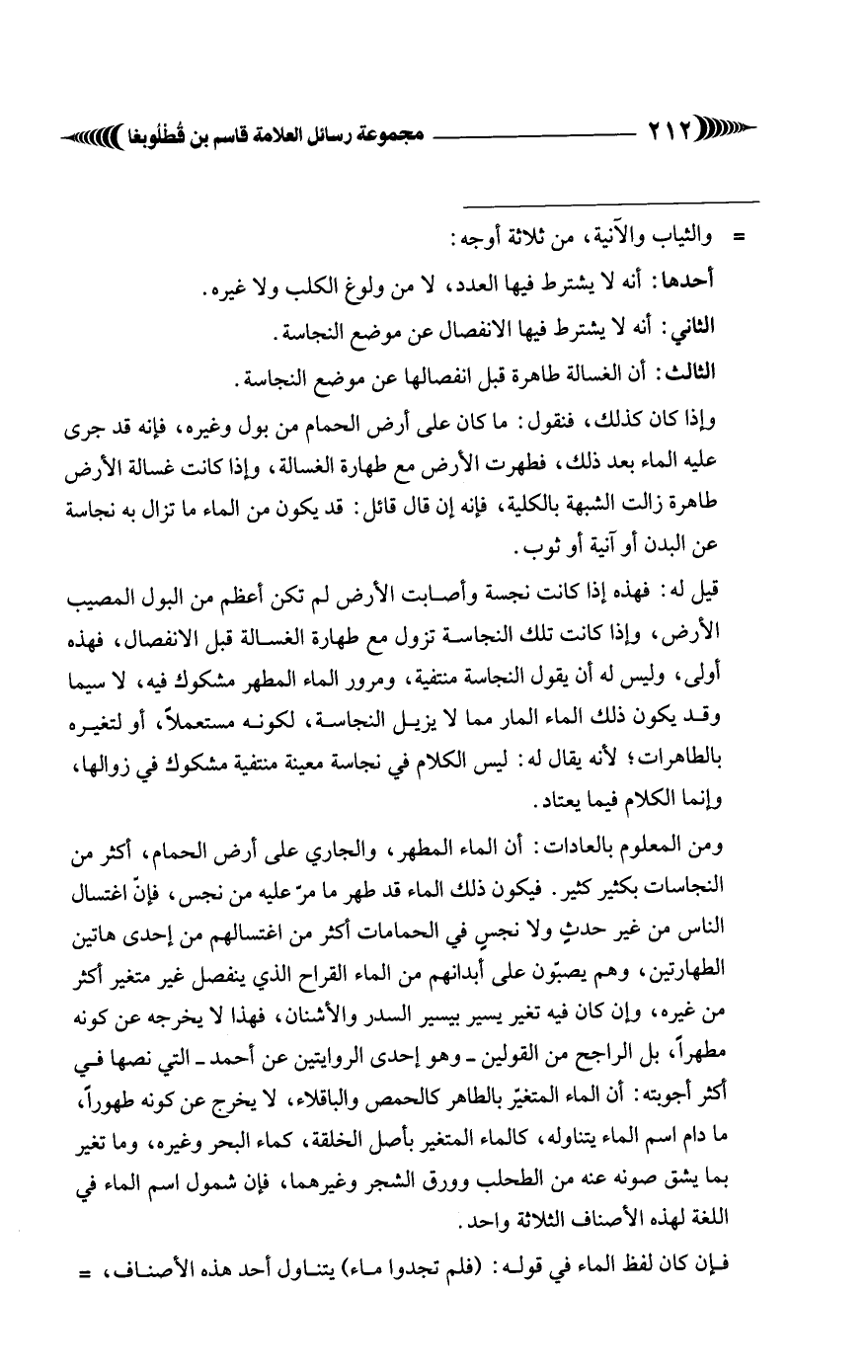 قيل له: فهذه إذا كانت نجسة وأصابت الأرض لم تكن أعظم من البول المصيب الأرض، وإذا كانت تلك النجاسة تزول مع طهارة الغسالة قبل الانفصال، فهذه أولى، وليس له أن يقول النجاسة منتفية، ومرور الماء المطهر مشكوك فيه، لا سيما وقد يكون ذلك الماء المار مما لا يزيل النجاسة، لكونه مستعملًا، أو لتغيره بالطاهرات؛ لأنه يقال له: ليس الكلام في نجاسة معينة منتفية مشكوك في زوالها، وإنما الكلام فيما يعتاد.