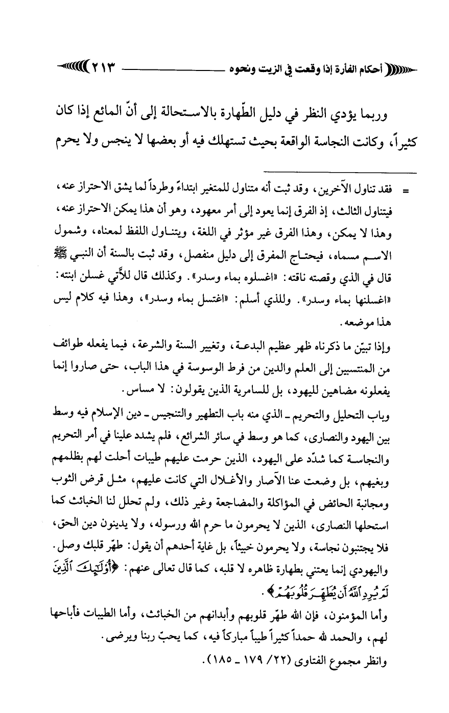 وياب التحليل والتحريم - الذي منه باب التطهير والتنجيس - دين الإسلام فيه وسط بين اليهود والنصارى، كما هو وسط في سائر الشراح، فلم يشدد علينا في أمر التحريم والنجاسة كما شدّد على اليهود، الذين حرمت عليهم طيبات أحلت لهم بظلمهم وبغيهم، بل وضعت عنا الآصار والأغلال التي كانت عليهم، مثل قرض الثوب ومجانبة الحائض في المؤاكلة والمضاجعة وغير ذلك، ولم تحلل لنا الخبائث كما استحلها النصارى، الذين لا يحرمون ما حرم الله ورسوله، ولا يدينون دين الحق، فلا يجتنبون نجاسة، ولا يحرمون خبيثًا، بل غاية أحدهم أن يقول: طهّر قلبك وصل. واليهودي إنما يعتني بطهارة ظاهره لا قلبه، كما قال تعالى عنهم: {أُولَئِكَ الَّذِينَ لَمْ يُرِدِ اللَّهُ أَنْ يُطَهِّرَ قُلُوبَهُمْ}.