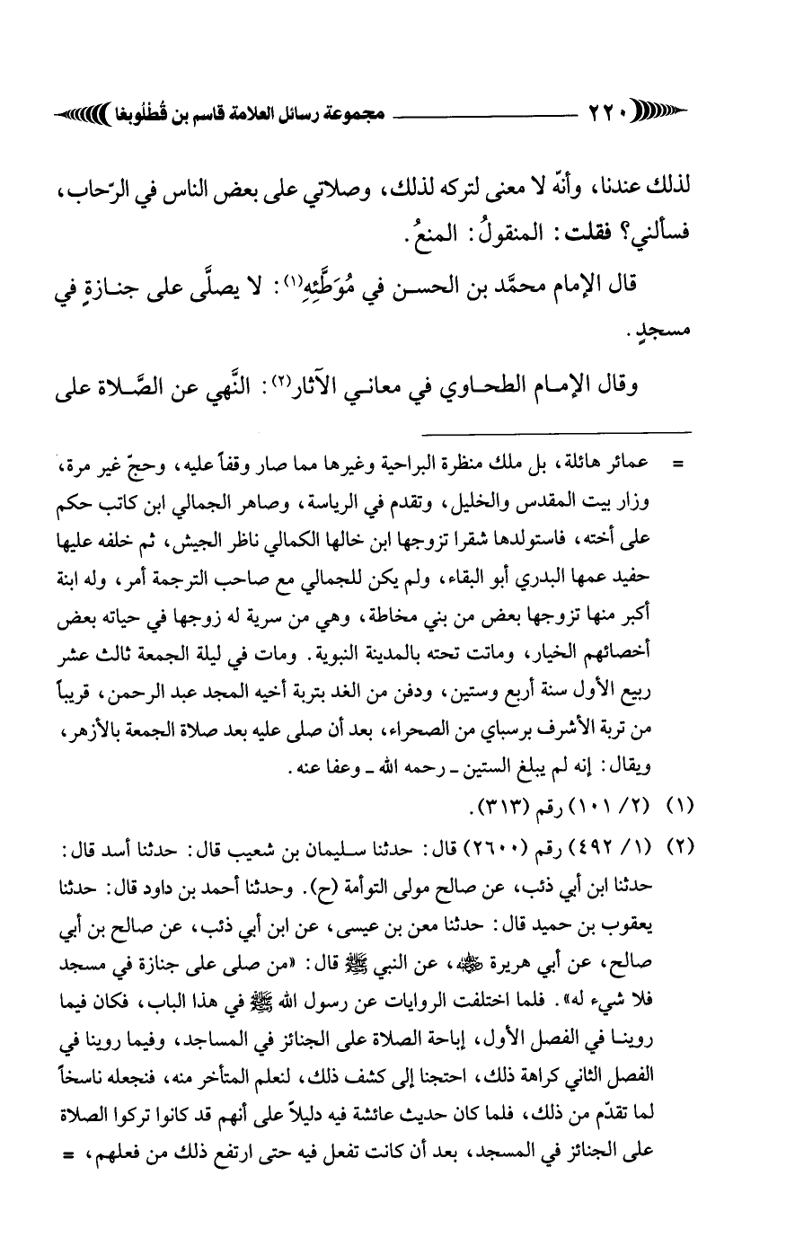(¬2) (1/ 492) رقم (2600) قال: حدثنا سليمان بن شعيب قال: حدثنا أسد قال: حدثنا ابن أبي ذئب، عن صالح مولى التوأمة (ح). وحدثنا أحمد بن داود قال: حدثنا يعقوب بن حميد قال: حدثنا معن بن عيسى، عن ابن أبي ذئب، عن صالح بن أبي صالح، عن أبي هريرة - رضي الله عنه -، عن النبي - صلى الله عليه وسلم - قال: "من صلى على جنازة في مسجد فلا شيء له". فلما اختلفت الروايات عن رسول الله - صلى الله عليه وسلم - في هذا الباب، فكان فيما روينا في الفصل الأول، إباحة الصلاة على الجنائز في المساجد، وفيما روينا في الفصل الثاني كراهة ذلك، احتجنا إلى كشف ذلك، لنعلم المتأخر منه، فنجعله ناسخًا لما تقدّم من ذلك، فلما كان حديث عائشة فيه دليلًا على أنهم قد كانوا تركوا الصلاة على الجنائز في المسجد، بعد أن كانت تفعل فيه حتى ارتفع ذلك من فعلهم،=