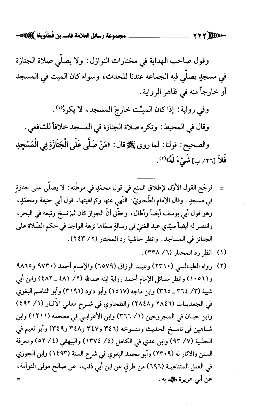 = فرجّح القول الأوّل لإطلاق المنع في قول محمَّدٍ في موطئه: لا يصلّى على جنازةٍ في مسجدٍ. وقال الإمام الطحاوي: النهي عنها وكراهيتها، قول أبي حنيفة ومحمدٍ، وهو قول أبي يوسف أيضًا وأطال، وحقق أن الجواز كان ثمّ نسخ وتبعه في البحر، وانتصر له أيضًا سيّدي عبد الغني في رسالةٍ سمّاها نزهة الواجد في حكم الصّلاة على الجنائز في المساجد. وانظر حاشية رد المحتار (2/ 243).