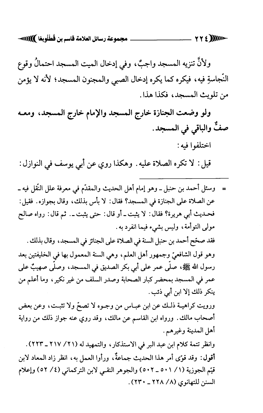 وهو قول الشافعى وجمهور أهل العلم، وهي السنة المعمول بها في الخليفتين بعد رسول الله - صلى الله عليه وسلم -، صلّى عمر على أبي بكر الصديق في المسجد، وصلّى صهيبٌ على عمر في المسجد بمحضر كبار الصحابة وصدر السلف من غير نكير، وما أعلم من ينكر ذلك إلا ابن أبي ذئب.
