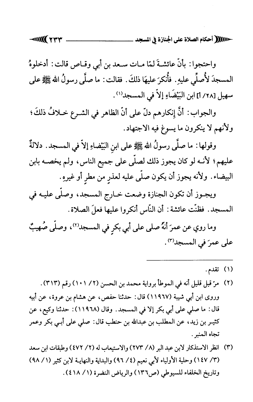 واحتجوا: بأنّ عائشةَ لمّا مات سعد بن أبي وقاص قالت: أدخلوهُ المسجدَ لأُصلِّي عليهِ. فأُنكرَ عليهَا ذلكَ. فقالت: ما صلَّى رسولُ الله - صلى الله عليه وسلم - على سهيل [28/ أ] ابن البَيْضَاءِ إلّا في المسجد (¬1).