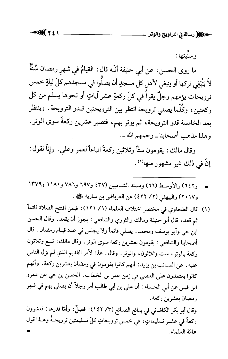 (¬1) قال الطحاوي في مختصر اختلاف العلماء (1/ 121): فيمن افتتح الصلاة قائمًا ثم قعد، قال أبو حنيفة ومالك والثوري والشافعي: يجوز أن يقعد. وقال الحسن ابن حي وأبو يوسف ومحمد: يصلي قائمًا ولا يجلس في عدد قيام رمضان. قال أصحابنا والشافعي: يقومون بعشرين ركعة سوى الوتر. وقال مالك: تسع وثلاثون ركعة بالوتر، ست وثلاثون، والوتر. وقال: هذا الأمر القديم الذي لم يزل الناس عليه. عن السائب بن يزيد: أنهم كانوا يقومون في رمضان بعشرين ركعة، وأنهم كانوا يعتمدون على العصي في زمن عمر بن الخطاب. الحسن بن حي عن عمرو ابن قيس عن أبي الحسناء: أن علي بن أبي طالب أمر رجلًا أن يصلي بهم في شهر رمضان بعشرين ركعة.