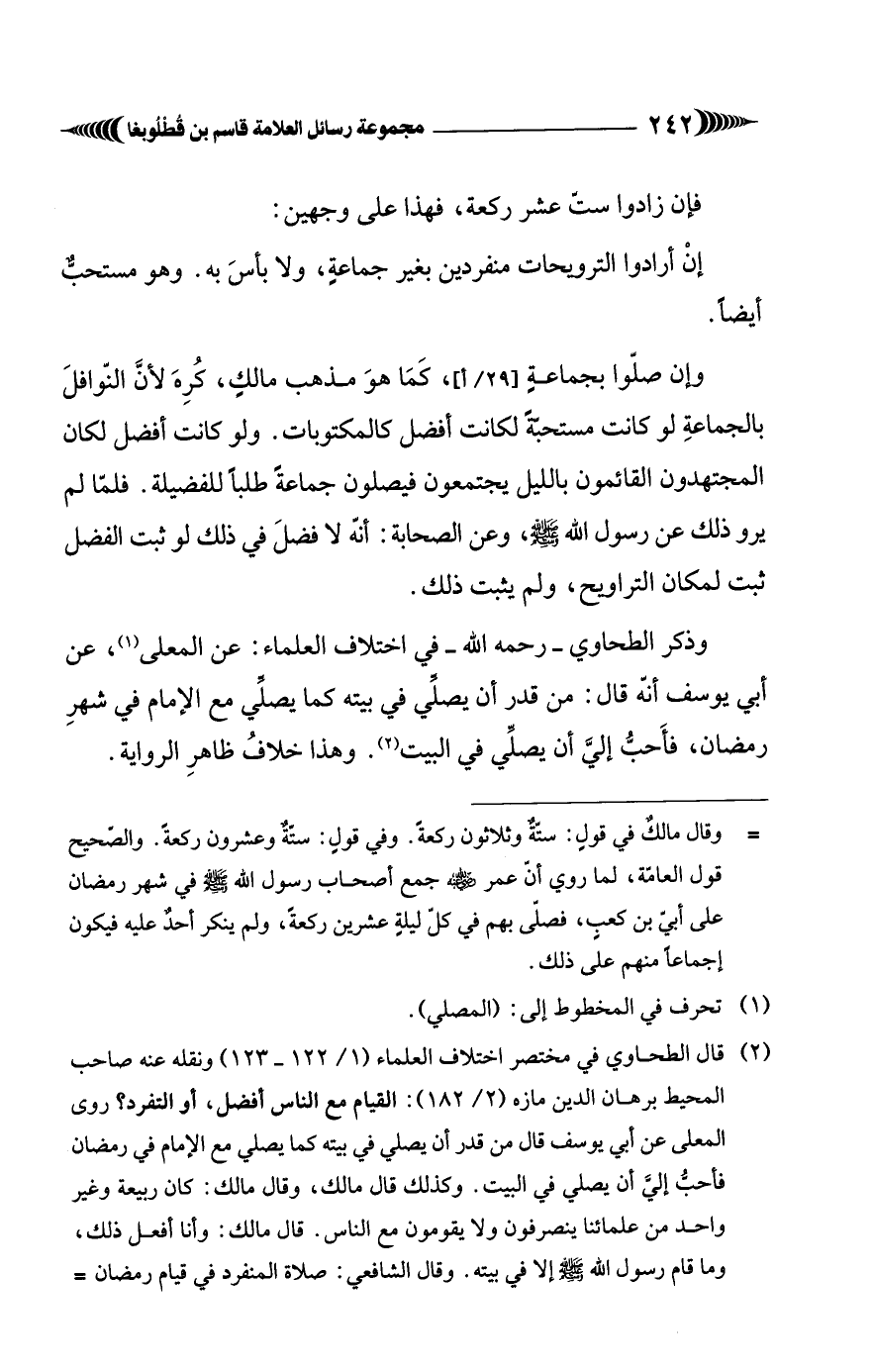 (¬2) قال الطحاوي في مختصر اختلاف العلماء (1/ 122 - 123) ونقله عنه صاحب المحيط برهان الدين مازه (2/ 182): القيام مع الناس أفضل، أو التفرد؟ روى المعلى عن أبي يوسف قال من قدر أن يصلي في بيته كما يصلي مع الإمام في رمضان فأحبُّ إليَّ أن يصلي في البيت. وكذلك قال مالك، وقال مالك: كان ربيعة وغير واحد من علمائنا ينصرفون ولا يقومون مع الناس. قال مالك: وأنا أفعل ذلك، وما قام رسول الله - صلى الله عليه وسلم - إلا في بيته. وقال الشافعي: صلاة المنفرد في قيام رمضان=