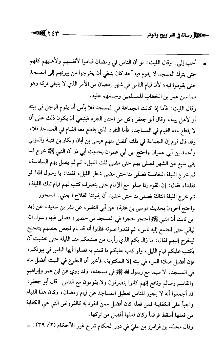 واحتج آخرون بحديث موسى بن عقبة، عن أبي النضر، عن بشر بن سعيد، عن زيد ابن ثابت أن النبي - صلى الله عليه وسلم - احتجر حجرة في المسجد من حصير، فصلى فيها رسول الله ليالي حتى اجتمع إليه ناس، ثم فقدوا صوته فظنوا أنه قد نام فجعل بعضهم يتنحنح ليخرج إليهم فقال: ما زال بكم الذي رأيت من صنيعكم منذ الليلة حتى خشيت أن يكتب عليكم قيام الليل، ولو كتب عليكم ما قمتم به فصلوا أيها الناس في بيوتكم، فإن أفضل صلاة المرء في بيته إلا المكتوبة، فأخبر أن التطوع في البيت أفضل منه في المسجد، لا سيما مع رسول الله - صلى الله عليه وسلم - في مسجده، وقد روي عن ابن عمر وإبراهيم والقاسم وسالم ونافع إنهم كانوا ينصرفون ولا يقومون مع الناس. قال أبو جعفر: قد أجمعوا أنه لا يجوز للناس تعطيل المساجد عن قيام رمضان، وكان هذا القيام واجبًا على الكفاية فمن فعله كان أفضل ممن انفرد به كالفروض التي هي الكفاية من فعلها أسقط فرضًا وكان فعلها أفضل من تركها.