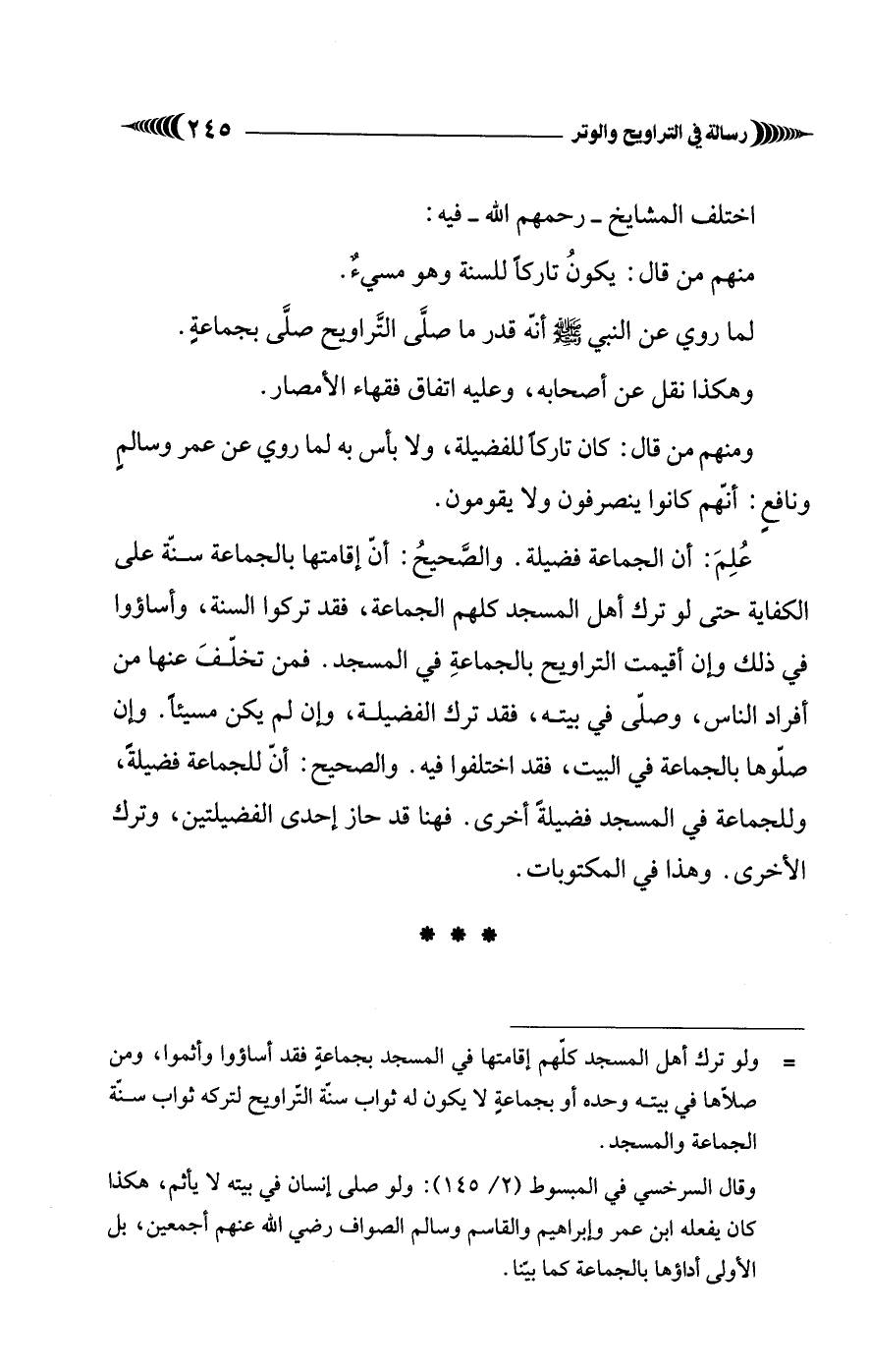 = ولو ترك أهل المسجد كلهم إقامتها في المسجد بجماعةٍ فقد أساؤوا وأثموا، ومن صلّاها في بيته وحده أو بجماعةٍ لا يكون له ثواب سنّة التّراويح لتركه ثواب سنّة الجماعة والمسجد.
