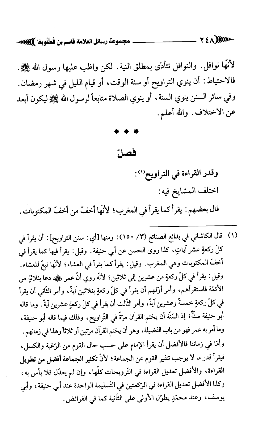 (¬1) قال الكاشاني في بدائع الصنائع (3/ 150): ومنها [أي: سنن التراويح]: أن يقرأ في كل ركعةٍ عشر آياتٍ، كذا روى الحسن عن أبي حنيفة. وقيل: يقرأ فيها كما يقرأ في أخفّ المكتوبات وهي المغرب. وقيل: يقرأ كما يقرأ في العشاء؛ لأنها تبعٌ للعشاء. وقيل: يقرأ في كلّ ركعةٍ من عشرين إلى ثلاثين؛ لأنه روي أن عمر - رضي الله عنه - دعا بثلاثةٍ من الأئمّة فاستقرأهم، وأمر أوّلهم أن يقرأ في كلّ ركعةٍ بثلاثين آيةً، وأمر الثاني أن يقرأ في كلّ ركعةٍ خمسةً وعشرين آيةً، وأمر الثّالث أن يقرأ في كل ركعةٍ عشرين آيةً. وما قاله أبو حنيفة سنةٌ إذ السّنة أن يختم القرآن مرةً في التّراويح، وذلك فيما قاله أبو حنيفة، وما أمر به عمر فهو من باب الفضيلة، وهو أن يختم القرآن مرتين أو ثلاثًا وهذا في زمانهم. وأما في زماننا فالأفضل أن يقرأ الإمام على حسب حال القوم من الرّغبة والكسل، فيقرأ قدر ما لا يوجب تنفير القوم عن الجماعة؛ لأن تكثير الجماعة أفضل من تطويل القراءة، والأفضل تعديل القراءة في الترويحات كلّها، وإن لم يعدّل فلا بأس به، وكذا الأفضل تعديل القراءة في الرّكعتين في التسليمة الواحدة عند أبي حنيفة، وأبي يوسف، وعند محمد يطوّل الأولى على الثانية كما في الفرائض.