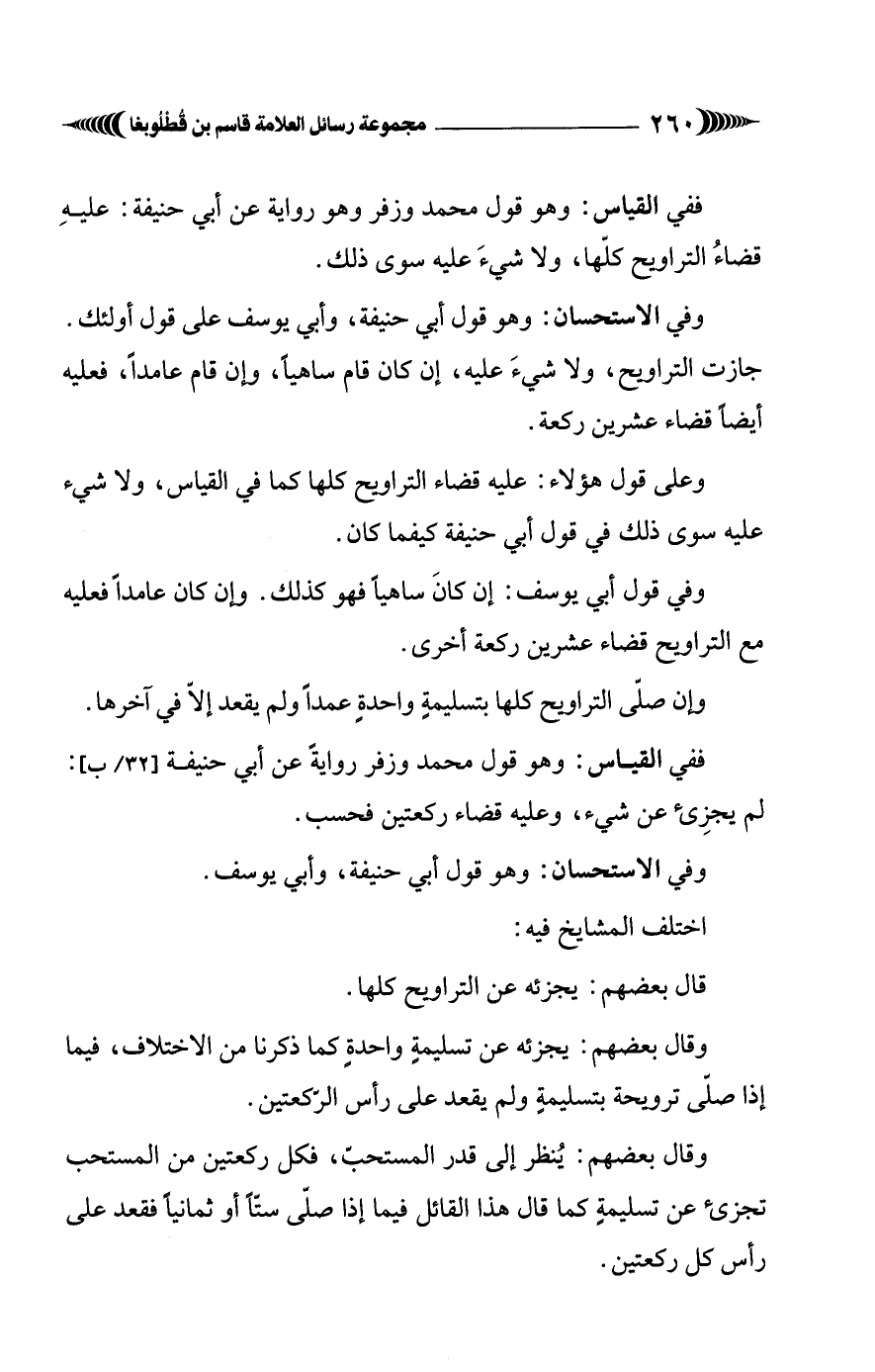 وفي الاستحسان: وهو قول أبي حنيفة، وأبي يوسف على قول أولئك. جازت التراويح، ولا شيءَ عليه، إن كان قام ساهيًا، وإن قام عامدًا، فعليه أيضًا قضاء عشرين ركعة.