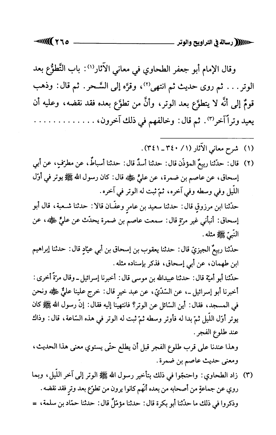 (¬3) زاد الطحاوي: واحتجّوا في ذلك بتأخير رسول الله - صلى الله عليه وسلم - الوتر إلى آخر اللّيل، وبما روي عن جماعةٍ من أصحابه من بعده أنهم كانوا يرون من تطوّع بعد وترٍ فقد نقضه.