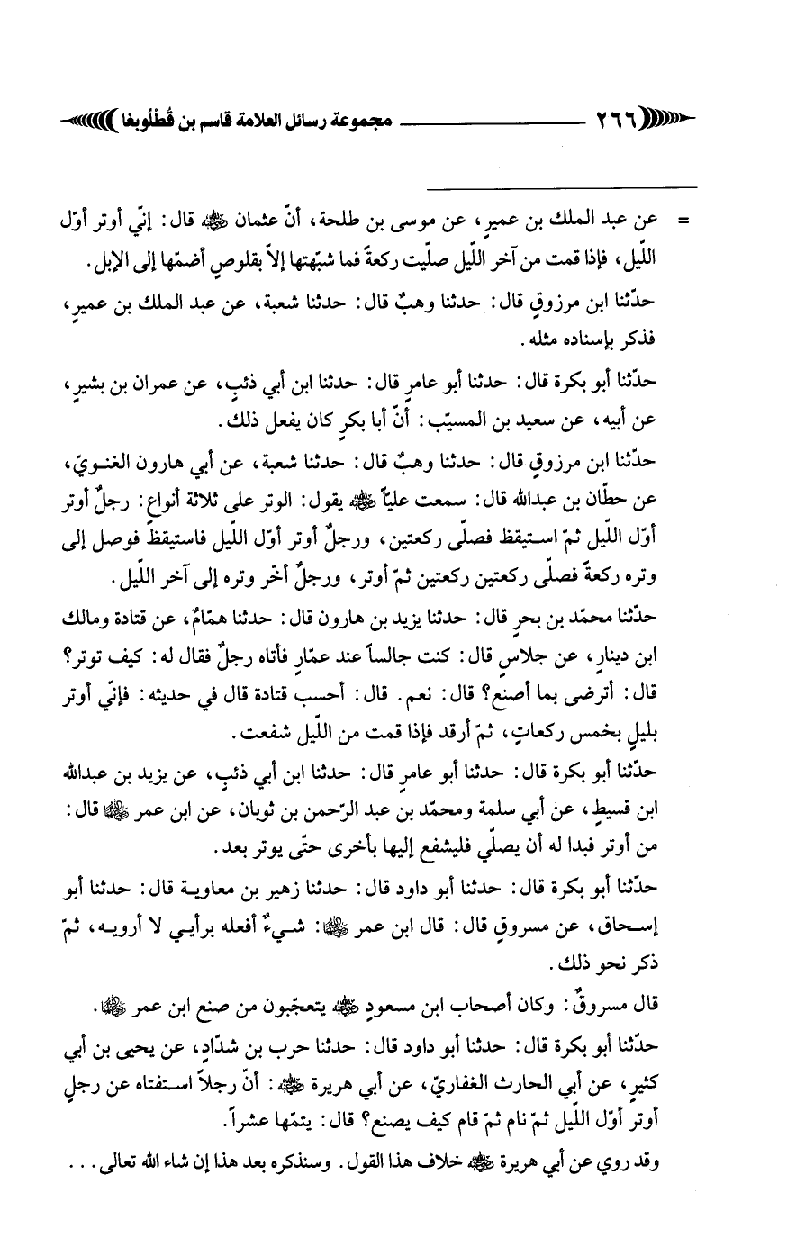قال مسروقٌ: وكان أصحاب ابن مسعودٍ، يتعجّبون من صنع ابن عمر - رضي الله عنهما -. حَدَّثَنَا أبو بكرة قال: حَدَّثَنَا أبو داود قال: حَدَّثَنَا حرب بْن شدّادٍ، عن يحيى بْن أبي كثيرٍ، عن أبي الحارث الغفاريِّ، عن أبي هريرة - رضي الله عنه -: أن رجلًا استفتاه عن رجلٍ أوتر أوّل اللَّيل ثمَّ نام ثمَّ قام كيف يصنع؟ قال: يتمّها عشرًا.