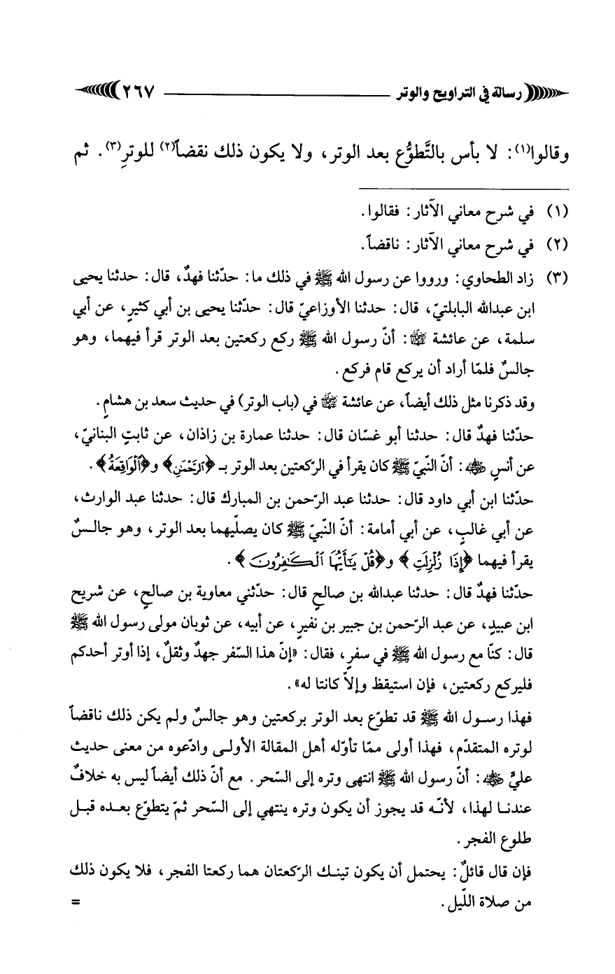 (¬3) زاد الطحاوي: ورووا عن رسول الله - صلى الله عليه وسلم - في ذلك ما: حَدَّثَنَا فهدٌ، قال: حَدَّثَنَا يحيى ابن عبد الله البابلتيّ، قال: حَدَّثَنَا الأوزاعيّ قال: حَدَّثَنَا يحيى بْن أبي كثيرٍ، عن أبي سلمة، عن عائشة - رضي الله عنها -: أن رسول الله - صلى الله عليه وسلم - ركع ركعتين بعد الوتر قرأ فيهما، وهو جالسٌ فلمّا أراد أن يركع قام فركع.