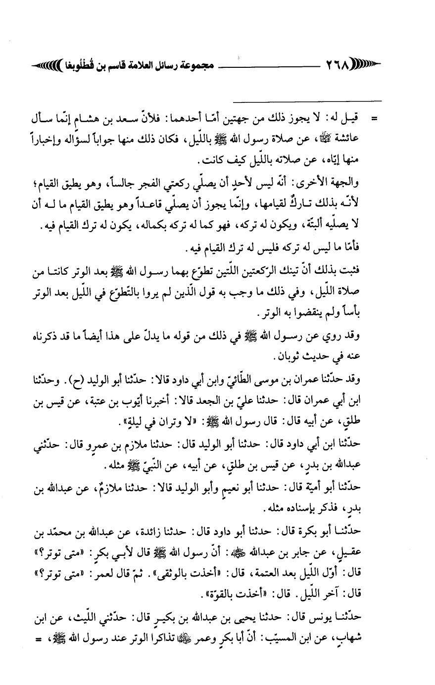 وقد حَدَّثَنَا عمران بْن موسى الطّائيّ وابن أبي داود قالا: حَدَّثَنَا أبو الوليد (ح). وحدَّثنا ابن أبي عمران قال: حَدَّثَنَا عليّ بْن الجعد قالا: أَخْبَرَنَا أيّوب بْن عتبة، عن قيس بْن طلقٍ، عن أبيه قال: قال رسول الله - صلى الله عليه وسلم -: "لا وتران في ليلةٍ".