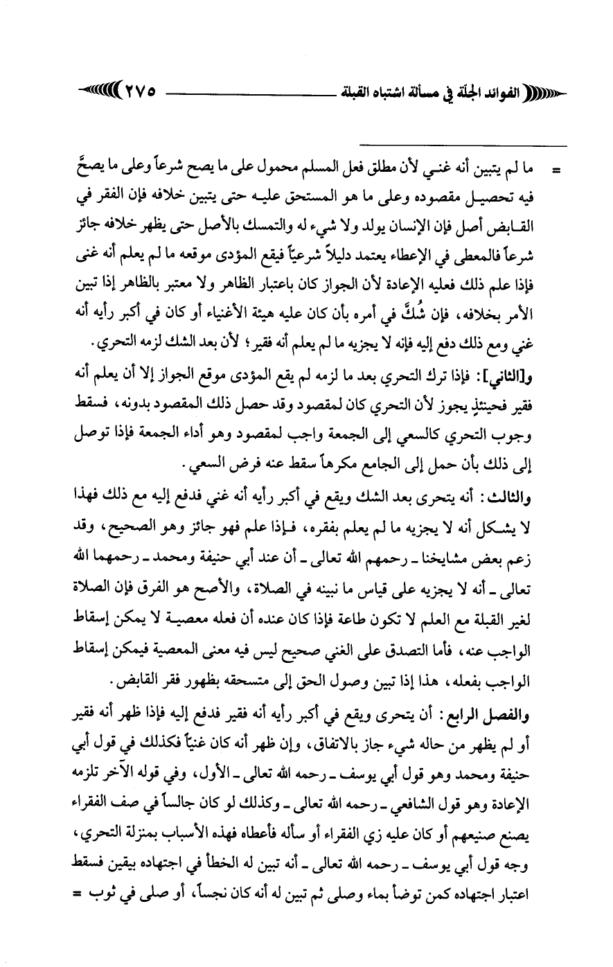 والفصل الرّابع: أن يتحرى ويقع في أكبر رأيه أنه فقير فدفع إليه فإذا ظهر أنه فقير أو لم يظهر من حاله شيء جاز بالاتفاق، وإن ظهر أنه كان غنيا فكذلك في قول أبي حنيفة ومحمد وهو قول أبي يوسف - رحمه الله تعالى - الأوّل، وفي قوله الآخر تلزمه الإعادة وهو قول الشّافعيّ - رحمه الله تعالى - وكذلك لو كان جالسًا في صف الفقراء يصنع صنيعهم أو كان عليه زي الفقراء أو سأله فأعطاه فهذه الأسباب بمنزلة التّحرِّي، وجه قول أبي يوسف - رحمه الله تعالى - أنه تبين له الخطأ في اجتهاده بيقين فسقط اعتبار اجتهاده كمن توضأ بماء وصلّى ثمّ تبين له أنه كان نجسًا، أو صلّى في ثوب =