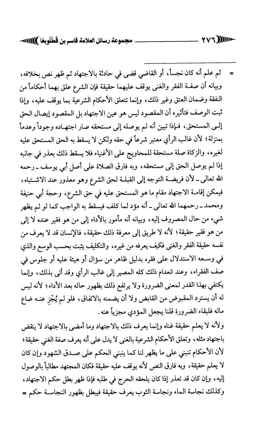 = ثمّ علم أنه كان نجسًا، أو القاضي قضى في حادثة بالاجتهاد ثمّ ظهر نصّ بخلافه، وبيانه أن صفة الفقر والغنى يوقف عليهما حقيقة فإن الشّرع علّق بهما أحكامًا من النفقة وضمان العتق وغير ذلك، وإنّما تتعلّق الأحكام الشرعية بما يوقف عليه، وإذا ثبت الوصف فتأثيره أن المقصود ليس هو عين الاجتهاد بل المقصود إيصال الحق إلى المستحق، فإذا تبين أنه لم يوصله إلى مستحقه صار اجتهاده وجودًا وعدمًا بمنزلة؛ لأنّ غالب الرأي معتبر شرعًا في حقه ولكن لا يسقط به الحق المستحق عليه لغيره، والزكاة صلة مستحقة للمحاويج على الأغنياء فلا يسقط ذلك بعذر في جانبه إذا لم يوصل الحق إلى مستحقه، وبه فارق الصّلاة على أصل أبي يوسف - رحمه الله تعالى - لأنّ فريضة التوجه إلى القبلة لحق الشّرع وهو معذور عند الاشتباه، فيمكن إقامة الاجتهاد مقام ما هو المستحق عليه في حق الشّرع، وحجة أبي حنيفة ومحمد - رحمهما الله تعالى - أنه مؤد لما كلف فيسقط به الواجب كما لو لم يظهر شيء من حال المصروف إليه، وبيانه أنه مأمور بالأداء إلى من هو فقير عنده لا إلى من هو فقير حقيقة؛ لأنه لا طريق إلى معرفة ذلك حقيقة، فالإنسان قد لا يعرف من نفسه حقيقة الفقر والغنى فكيف يعرفه من غيره، والتكليف يثبت بحسب الوسع والذي في وسعه الاستدلال على فقره بدليل ظاهر من سؤال أو هيئة عليه أو جلوس في صف الفقراء، وعند انعدام ذلك كله المصير إلى غالب الرأي وقد أتى بذلك، وإنما يكتفي بهذا القدر لمعنى الضّرورة ولا يرتفع ذلك بظهور حاله بعد الأداء؛ لأنه ليس له أن يسترد المقبوض من القابض ولا أن يضمنه بالاتفاق، فلو لم يُجْزِ عنه ضاع ماله فلبقاء الضّرورة قلنا يجعل المؤدي مجزيًا عنه.