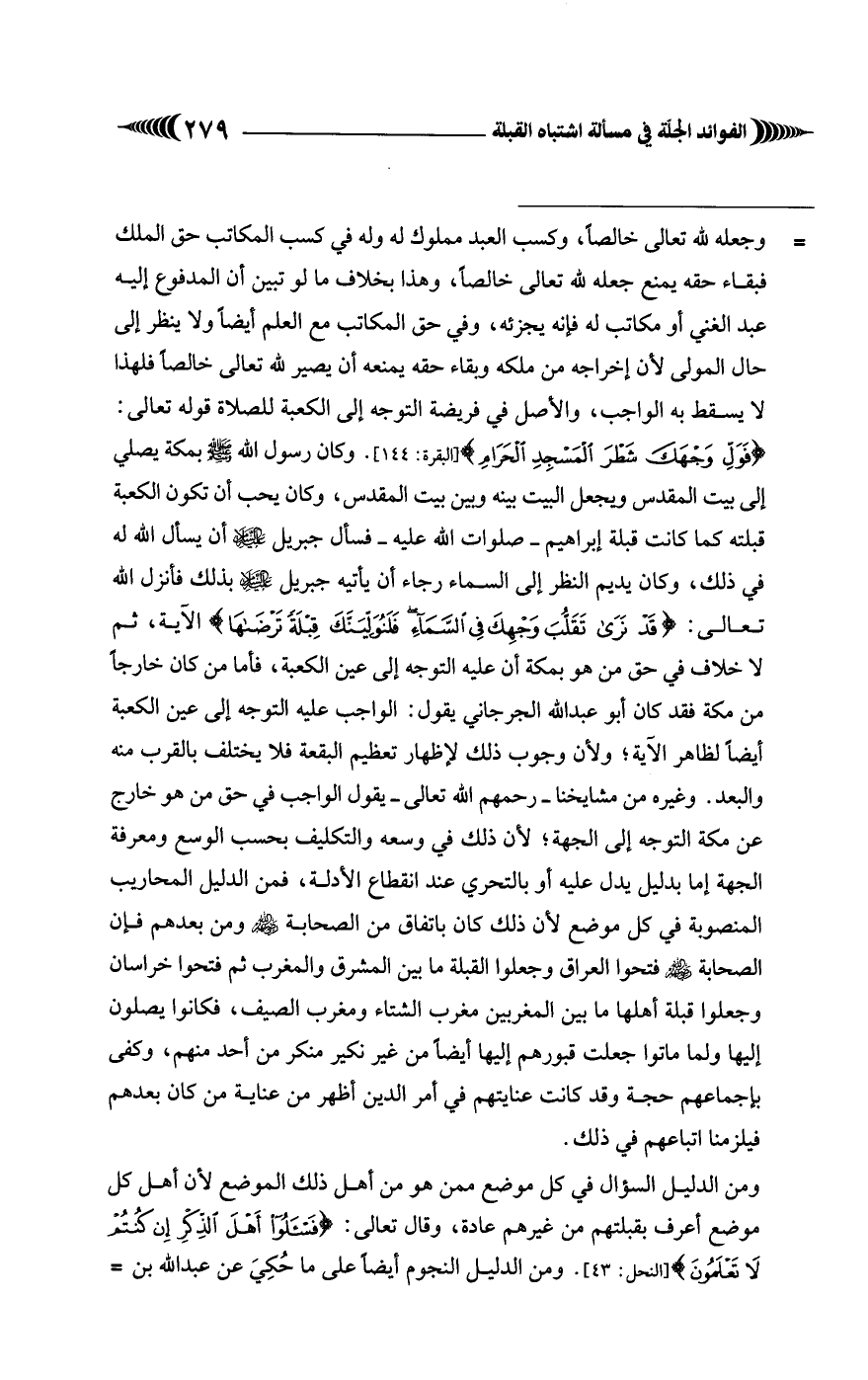 = وجعله لله تعالى خالصًا، وكسب العبد مملوك له وله في كسب المكاتب حق الملك فبقاء حقه يمنع جعله لله تعالى خالصًا، وهذا بخلاف ما لو تبين أن المدفوع إليه عبد الغني أو مكاتب له فإنه يجزئه، وفي حق المكاتب مع العلم أيضًا ولا ينظر إلى حال المولى لأنّ إخراجه من ملكه وبقاء حقه يمنعه أن يصير لله تعالى خالصا فلهذا لا يسقط به الواجب، والأصل في فريضة التوجه إلى الكعبة للصلاة قوله تعالى: {فَوَلِّ وَجْهَكَ شَطْرَ الْمَسْجِدِ الْحَرَامِ} [البقرة: 144]. وكان رسول الله - صلى الله عليه وسلم - بمكة يصلّي إلى بيت المقدس ويجعل البيت بينه وبين بيت المقدس، وكان يحب أن تكون الكعبة قبلته كما كانت قبلة إبراهيم - صلوات الله عليه - فسأل جبريل - عليه السلام - أن يسأل الله له في ذلك، وكان يديم النظر إلى السَّماء رجاء أن يأتيه جبريل - عليه السلام - بذلك فانزل الله تعالى: {قَدْ نَرَى تَقَلُّبَ وَجْهِكَ فِي السَّمَاءِ فَلَنُوَلِّيَنَّكَ قِبْلَةً تَرْضَاهَا} الآية، ثمّ لا خلاف في حق من هو بمكة أن عليه التوجه إلى عين الكعبة، فأمَّا من كان خارجًا من مكّة فقد كان أبو عبد الله الجرجاني يقول: الواجب عليه التوجه إلى عين الكعبة أيضًا لظاهر الآية؛ ولأن وجوب ذلك لإظهار تعظيم البقعة فلا يختلف بالقرب منه والبعد. وغيره من مشايخنا - رحمهم الله تعالى - يقول الواجب في حق من هو خارج عن مكّة التوجه إلى الجهة؛ لأنّ ذلك في وسعه والتكليف بحسب الوسع ومعرفة الجهة إمّا بدليل يدلُّ عليه أو بالتحري عند انقطاع الأدلة، فمن الدّليل المحاريب المنصوبة في كلّ موضع لأنّ ذلك كان باتِّفاق من الصّحابة - رضي الله عنهم - ومن بعدهم فإن الصّحابة - رضي الله عنهم - فتحوا العراق وجعلوا القبلة ما بين المشرق والمغرب ثمّ فتحوا خراسان وجعلوا قبلة أهلها ما بين المغربين مغرب الشتاء ومغرب الصيف، فكانوا يصلون إليها ولما ماتوا جعلت قبورهم إليها أيضًا من غير نكير منكر من أحد منهم، وكفى بإجماعهم حجة وقد كانت عنايتهم في أمر الدين أظهر من عناية من كان بعدهم فيلزمنا اتباعهم في ذلك.