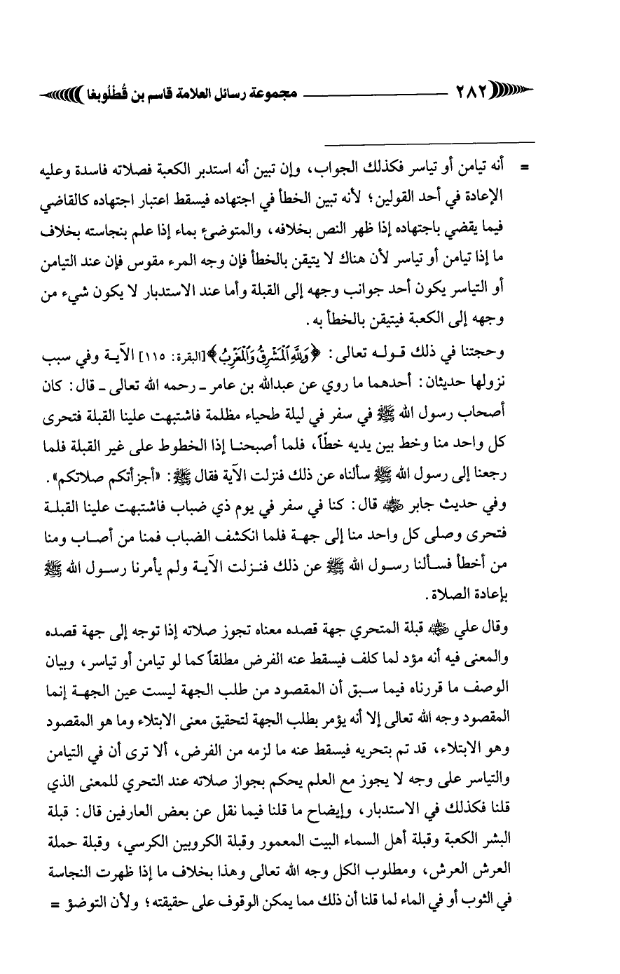 = أنه تيامن أو تياسر فكذلك الجواب، وإن تبين أنه استدبر الكعبة فصلاته فاسدة وعليه الإعادة في أحد القولين؛ لأنه تبين الخطأ في اجتهاده فيسقط اعتبار اجتهاده كالقاضي فيما يقضي باجتهاده إذا ظهر النص بخلافه، والمتوضئ بماء إذا علم بنجاسته بخلاف ما إذا تيامن أو تياسر لأنّ هناك لا يتيقن بالخطأ فإن وجه المرء مقوس فإن عند التيامن أو التياسر يكون أحد جوانب وجهه إلى القبلة وأما عند الاستدبار لا يكون شيء من وجهه إلى الكعبة فيتيقن بالخطأ به.