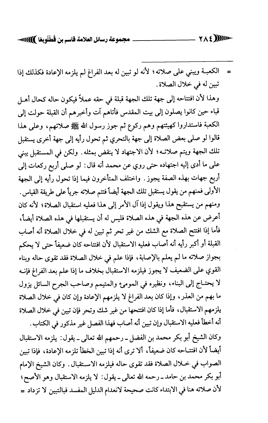 وكان الشّيخ أبو بكر محمّد بْن الفضل - رحمهم الله تعالى - يقول: يلزمه الاستقبال أيضًا لأنّ افتتاحه كان ضعيفًا، ألَّا ترى أنه إذا تبين الخطأ تلزمه الإعادة، فإذا تبين الصواب في خلال الصّلاة فقد تقوى حاله فيلزمه الاستقبال. وكان الشّيخ الإمام أبو بكر محمّد بْن حامد - رحمه الله تعالى - يقول: لا يلزمه الاستقبال وهو الأصح؛ لأنّ صلاته هنا في الابتداء كانت صحيحة لانعدام الدّليل المفسد فبالتبين لا تزداد =