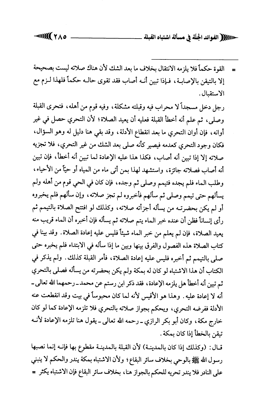 رجل دخل مسجدًا لا محراب فيه وقبلته مشكلة، وفيه قوم من أهله، فتحرى القبلة وصلّى، ثمّ علم أنه أخطأ القبلة فعليه أن يعيد الصّلاة؛ لأنّ التّحرِّي حصل في غير أوانه، فإن أوان التّحرِّي ما بعد انقطاع الأدلة، وقد بقي هنا دليل له وهو السؤال، فكان وجود التّحرِّي كعدمه فيصير كأنه صلّى بعد الشك من غير التّحرِّي، فلا تجزيه صلاته إِلَّا إذا تبين أنه أصاب، فكذا هذا عليه الإعادة لما تبين أنه أخطأ، فإن تبين أنه أصاب فصلاته جائزة، واستشهد لهذا بمن أتى ماء من المياه أو حيًّا من الأحياء، وطلب الماء فلم يجده فتيمم وصلّى ثمّ وجده، فإن كان في الحي قوم من أهله ولم يسألهم حتّى تيمم وصلّى ثمّ سألهم فأخبروه لم تجز صلاته، وإن سألهم فلم يخبروه أو لم يكن بحضرته من يسأله أجزأته صلاته، وكذلك لو افتتح الصّلاة بالتيمُّم ثمّ رأى إنسانًا فظن أن عنده خبر الماء يتم صلاته ثمّ يسأله فإن أخبره أن الماء قريب منه يعيد الصّلاة، فإن لم يعلم من خبر الماء شيئًا فليس عليه إعادة الصّلاة. وقد بيَّنَّا في كتاب الصّلاة هذه الفصول والفرق بينها وبين ما إذا سأله في الابتداء فلم يخبره حتّى صلّى بالتيمُّم ثمّ أخبره فليس عليه إعادة الصّلاة، فأمر القبلة كذلك. ولم يذكر في الكتاب أن هذا الاشتباه لو كان له بمكة ولم يكن بحضرته من يسأله فصلّى بالتحري ثمّ تبين أنه أخطأ هل يلزمه الإعادة، فقد ذكر ابن رستم عن محمّد - رحمهما الله تعالى - أنه لا إعادة عليه. وهذا هو الأقيس لأنه لما كان محبوسًا في بيت وقد انقطعت عنه الأدلة ففرضه التّحرِّي، ويحكم بجواز صلاته بالتحري فلا تلزمه الإعادة كما لو كان خارج مكّة، وكان أبو بكر الرَّازيُّ - رحمه الله تعالى - يقول هنا تلزمه الإعادة لأنه تيقن بالخطأ إذا كان بمكة.