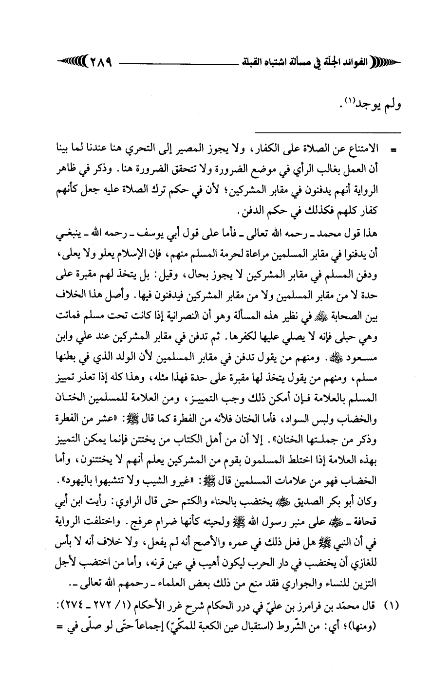 هذا قول محمّد - رحمه الله تعالى - فأمَّا على قول أبي يوسف - رحمه الله - ينبغي أن يدفنوا في مقابر المسلمين مراعاة لحرمة المسلم منهم، فإن الإسلام يعلو ولا يعلى، ودفن المسلم في مقابر المشركين لا يجوز بحال، وقيل: بل يتخذ لهم مقبرة على حدة لا من مقابر المسلمين ولا من مقابر المشركين فيدفنون فيها. وأصل هذا الخلاف بين الصّحابة - رضي الله عنهم - في نظير هذه المسألةُ وهو أن النصرانية إذا كانت تحت مسلم فماتت وهي حبلى فإنه لا يصلّي عليها لكفرها. ثمّ تدفن في مقابر المشركين عند علي وابن مسعود - رضي الله عنهما -. ومنهم من يقول تدفن في مقابر المسلمين لأنّ الولد الّذي في بطنها مسلم، ومنهم من يقول يتخذ لها مقبرة على حدة فهذا مثله، وهذا كله إذا تعذر تمييز المسلم بالعلّامة فإن أمكن ذلك وجب التمييز، ومن العلّامة للمسلمين الختان والخضاب ولبس السواد، فأمَّا الختان فلأنه من الفطرة كما قال - صلى الله عليه وسلم -: "عشر من الفطرة وذكر من جملتها الختان". إِلَّا أن من أهل الكتاب من يختتن فإنّما يمكن التمييز بهذه العلّامة إذا اختلط المسلمون بقوم من المشركين يعلم أنهم لا يختتنون، وأما الخضاب فهو من علامات المسلمين قال - صلى الله عليه وسلم -: "غيرو الشيب ولا تتشبهوا باليهود". وكان أبو بكر الصديق - رضي الله عنه - يختضب بالحناء والكتم حتّى قال الراوي: رأيت ابن أبي قحافة - رضي الله عنه - على منبر رسول الله - صلى الله عليه وسلم - ولحيته كأنّها ضرام عرفج. واختلفت الرِّواية في أن النّبيّ - صلى الله عليه وسلم - هل فعل ذلك في عمره والأصح أنه لم يفعل، ولا خلاف أنه لا بأس للغازي أن يختضب في دار الحرب ليكون أهيب في عين قرنه، وأما من اختضب لأجل التزين للنساء والجواري فقد منع من ذلك بعض العلماء - رحمهم الله تعالى -.