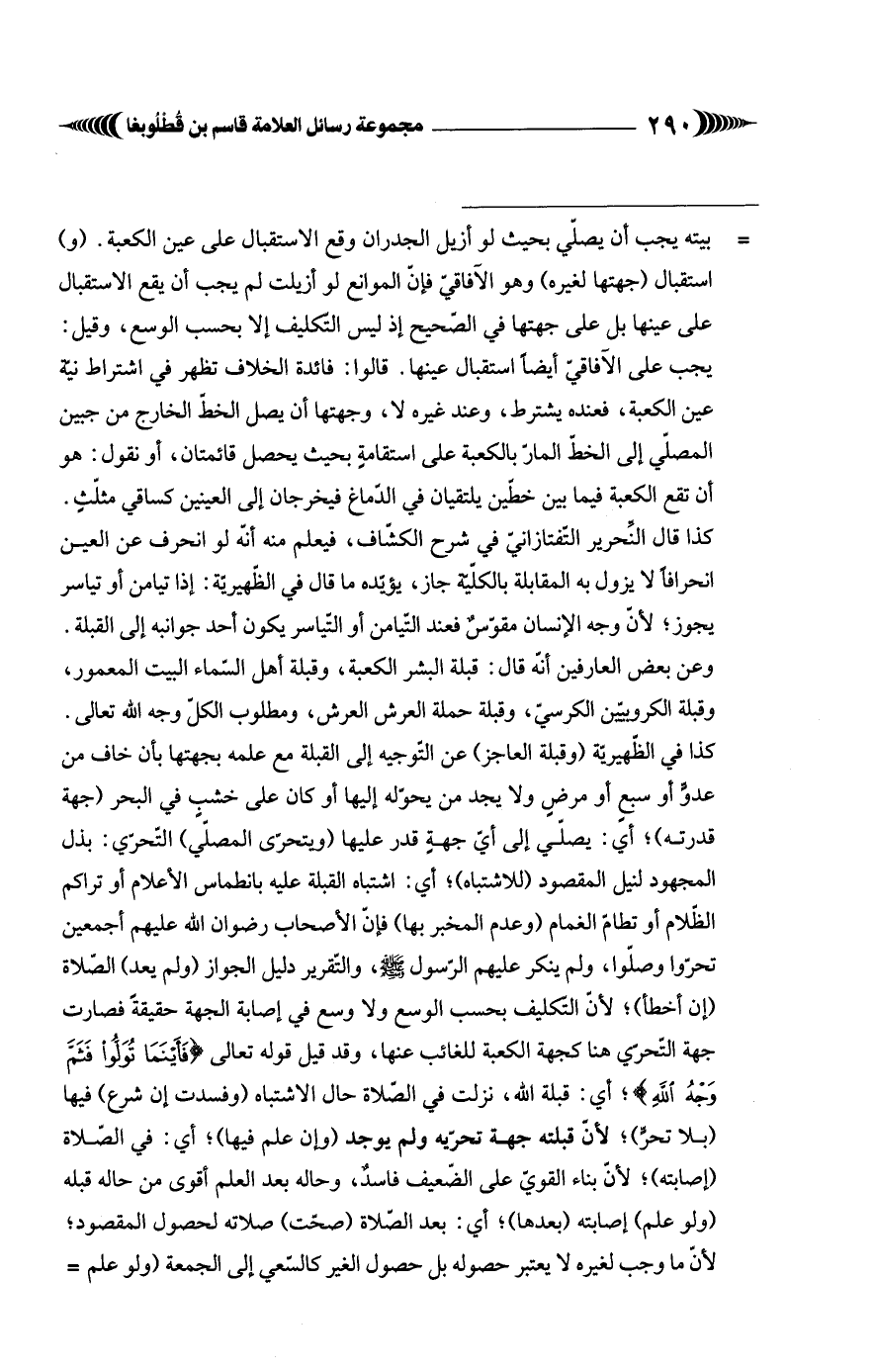 = بيته يجب أن يصلّي بحيث لو أزيل الجدران وقع الاستقبال على عين الكعبة. (و) استقبال (جهتها لغيره) وهو الآفاقيّ فإنّ الموانع لو أزيلت لم يجب أن يقع الاستقبال على عينها بل على جهتها في الصّحيح إذ ليس التكليف إِلَّا بحسب الوسع، وقيل: يجب على الآفاقيّ أيضًا استقبال عينها. قالوا: فائدة الخلاف تظهر في اشتراط نيّة عين الكعبة، فعنده يشترط، وعند غيره لا، وجهتها أن يصل الخطّ الخارج من جبين المصلّي إلى الخطّ المارّ بالكعبة على استقامةٍ بحيث يحصل قائمتان، أو نقول: هو أن تقع الكعبة فيما بين خطّين يلتقيان في الدّماغ فيخرجان إلى العينين كساقي مثلّثٍ. كذا قال النِّحرير التَّفتازانيّ في شرح الكشاف، فيعلم منه أنّه لو انحرف عن العين انحرافًا لا يزول به المقابلة بالكفية جاز، يؤيده ما قال في الظّهيريّة: إذا تيامن أو تياسر يجوز؛ لأنّ وجه الإنسان مقوّسٌ فعند التيامن أو التياسر يكون أحد جوانبه إلى القبلة. وعن بعض العارفين أنّه قال: قبلة البشر الكعبة، وقبلة أهل السّماء البيت المعمور، وقبلة الكروبيّين الكرسيّ، وقبلة حملة العرش العرش، ومطلوب الكل وجه الله تعالى. كذا في الظّهيريّة (وقبلة العاجز) عن التّوجيه إلى القبلة مع علمه بجهتها بأن خاف من عدوٍّ أو سبعٍ أو مرضٍ ولا يجد من يحوّله إليها أو كان على خشب في البحر (جهة قدرته)؛ أي: يصلّي إلى أيّ جهةٍ قدر عليها (ويتحرّى المصلّي) التّحرّي: بذل المجهود لنيل المقصود (للاشتباه)؛ أي: اشتباه القبلة عليه بانطماس الأعلام أو تراكم الظّلام أو تطامّ الغمام (وعدم المخبر بها) فإنّ الأصحاب رضوان الله عليهم أجمعين تحرّوا وصلّوا، ولم ينكر عليهم الرّسول - صلى الله عليه وسلم -، والتقرير دليل الجواز (ولم يعد) الصّلاة (إن أخطأ)؛ لأنّ التكليف بحسب الوسع ولا وسع في إصابة الجهة حقيقةً فصارت جهة التّحرِّي هنا كجهة الكعبة للغائب عنها، وقد قيل قوله تعالى {فَأَيْنَمَا تُوَلُّوا فَثَمَّ وَجْهُ اللَّهِ}؛ أي: قبلة اللُّه، نزلت في الصّلاة حال الاشتباه (وفسدت إن شرع) فيها (بلا تحرٍّ)؛ لأنّ قبلته جهة تحرّيه ولم يوجد (وإن علم فيها)؛ أي: في الصّلاة (إصابته)؛ لأنّ بناء القويّ على الضّعيف فاسدٌ، وحاله بعد العلم أقوى من حاله قبله (ولو علم) إصابته (بعدها)؛ أي: بعد الصّلاة (صحّت) صلاته لحصول المقصود؛ لأنّ ما وجب لغيره لا يعتبر حصوله بل حصول الغير كالسّعي إلى الجمعة (ولو علم =