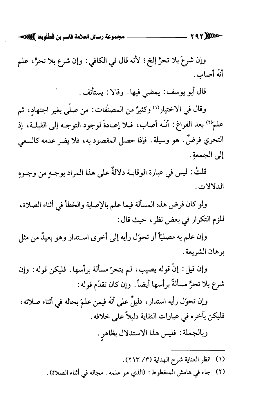 وإن تحوّل رأيه استدار، دليلٌ على أنّه فيمن علمَ بحاله في أثناء صلاته، فليكن بآخره في عبارات النقاية دليلًا على خلافه.