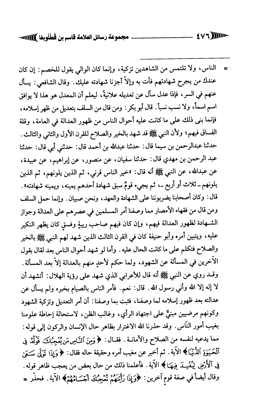 = الناس، ولا تلتمس من الشاهدين تزكية، وإنما كان الوالي يقول للخصم: إن كان عندك من يجرح شهادتهم فأت به وإلا أجزنا شهادته عليك. وقال الشافعي: يسأل عنهم في السر، فإذا عدل سأل عن تعديله علانيةً، ليعلم أن المعدل هو هذا لا يوافق اسم اسمًا، ولا نسب نسبًا. قال أبو بكر: ومن قال من السلف بتعديل من ظهر إسلامه، فإنما بنى ذلك على ما كانت عليه أحوال الناس من ظهور العدالة في العامة، وقلة الفساق فيهم؛ ولأن النبي - صلى الله عليه وسلم - قد شهد بالخير والصلاح للقرن الأول والثاني والثالث. حدثنا عبد الرحمن بن سيما قال: حدثنا عبد الله بن أحمد قال: حدثني أبي قال: حدثنا عبد الرحمن بن مهدي قال: حدثنا سفيان، عن منصور، عن إبراهيم، عن عبيدة، عن عبد الله، عن النبي - صلى الله عليه وسلم - أنه قال: "خير الناس قرني، ثم الذين يلونهم، ثم الذين يلونهم - ثلاث أو أربع -، ثم يجيء قومٌ سبق شهادة أحدهم يمينه، ويمينه شهادته". قال: وكان أصحابنا يضريوننا على الشهادة والعهد، ونحن صبيان. وإنما حمل السلف ومن قال من فقهاء الأمصار مما وصفنا أمر المسلمين في عصرهم على العدالة وجواز الشهادة لظهور العدالة فيهم، وإن كان فيهم صاحب ريبةٍ وفسق كان يظهر النكير عليه، ويتبين أمره وأبو حنيفة كان في القرن الثالث الذين شهد لهم النبي - صلى الله عليه وسلم - بالخير والصلاح فتكلم على ما كانت الحال عليه. وأما لو شهد أحوال الناس بعد لقال يقول الآخرين في المسألة عن الشهود، ولما حكم لأحدٍ منهم بالعدالة إلَّا بعد المسألة. وقد روي عن النبي - صلى الله عليه وسلم - أنه قال للأعرابي الذي شهد على رؤية الهلال: أتشهد أن لا إله إلا الله وأني رسول الله. قال: نعم. فأمر الناس بالصيام بخبره ولم يسأل عن عدالته بعد ظهور إسلامه لما وصفنا، مثبت بما وصفنا: أن أمر التعديل وتزكية الشهود وكونهم مرضيين مبنيٌّ على اجتهاد الرأي، وغالب الظن، لاستحالة إحاطة علومنا بغيب أمور الناس. وقد حذرنا الله الاغترار بظاهر حال الإنسان والركون إلى قوله: مما يدعيه لنفسه من الصلاح والأمانة. فقال: {وَمِنَ النَّاسِ مَنْ يُعْجِبُكَ قَوْلُهُ فِي الْحَيَاةِ الدُّنْيَا} [البقرة: 204] الآية. ثم أخبر عن مغيب أمره وحقيقة حاله فقال: {وَإِذَا تَوَلَّى سَعَى فِي الْأَرْضِ لِيُفْسِدَ فِيهَا} [البقرة: 205] الآية. فأعلمنا ذلك من حال بعض من يعجب ظاهر قوله. وقال أيضًا في صفة قومٍ آخرين: {وَإِذَا رَأَيْتَهُمْ تُعْجِبُكَ أَجْسَامُهُمْ} [المنافقون: 4] الآية. فحذر=