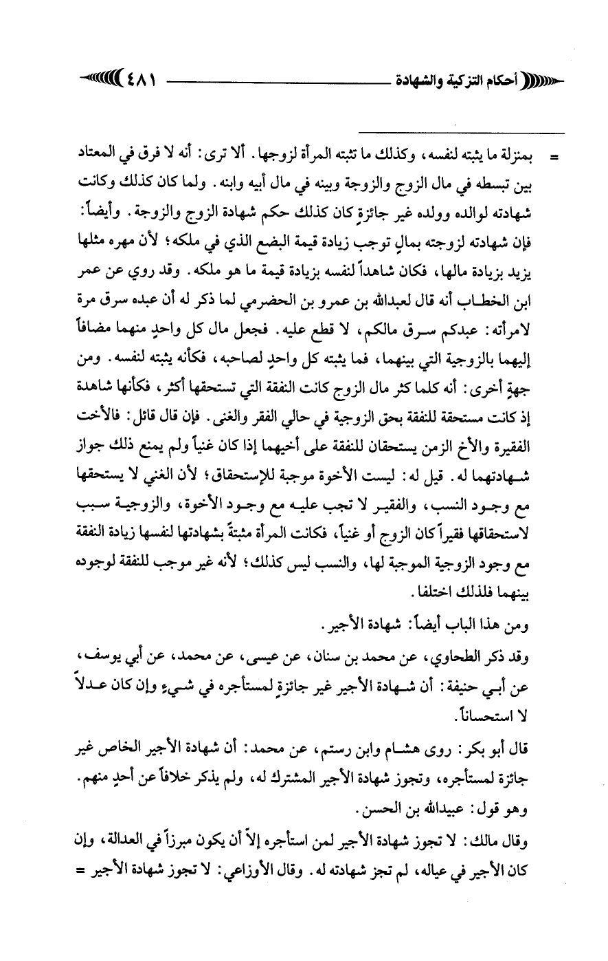 = بمنزلة ما يثبته لنفسه، وكذلك ما تثبته المرأة لزوجها. ألا ترى: أنه لا فرق في المعتاد بين تبسطه في مال الزوج والزوجة وبينه في مال أبيه وابنه. ولما كان كذلك وكانت شهادته لوالده وولده غير جائزةٍ كان كذلك حكم شهادة الزوج والزوجة. وأيضًا: فإن شهادته لزوجته بمالٍ توجب زيادة قيمة البضع الذي في ملكه؛ لأن مهره مثلها يزيد بزيادة مالها، فكان شاهدًا لنفسه بزيادة قيمة ما هو ملكه. وقد روي عن عمر ابن الخطاب أنه قال لعبد الله بن عمرو بن الحضرمي لما ذكر له أن عبده سرق مرة لامرأته: عبدكم سرق مالكم، لا قطع عليه. فجعل مال كل واحدٍ منهما مضافًا إليهما بالزوجية التي بينهما، فما يثبته كل واحدٍ لصاحبه، فكأنه يثبته لنفسه. ومن جهةٍ أخرى: أنه كما أكثر مال الزوج كانت النفقة التي تستحقها أكثر، فكأنها شاهدة إذ كانت مستحقة للنفقة بحق الزوجية في حالي الفقر والغنى. فإن قال قائل: فالأخت الفقيرة والأخ الزمن يستحقان للنفقة على أخيهما إذا كان غنيًا ولم يمنع ذلك جواز شهادتهما له. قيل له: ليست الأخوة موجبة للاستحقاق؛ لأن الغني لا يستحقها مع وجود النسب، والفقير لا تجب عليه مع وجود الأخوة، والزوجية سبب لاستحقاقها فقيرًا كان الزوج أو غنيًا، فكانت المرأة مثبتةً بشهادتها لنفسها زيادة النفقة مع وجود الزوجية الموجبة لها، والنسب ليس كذلك؛ لأنه غير موجب للنففة لوجوده بينهما فلذلك اختلفا.