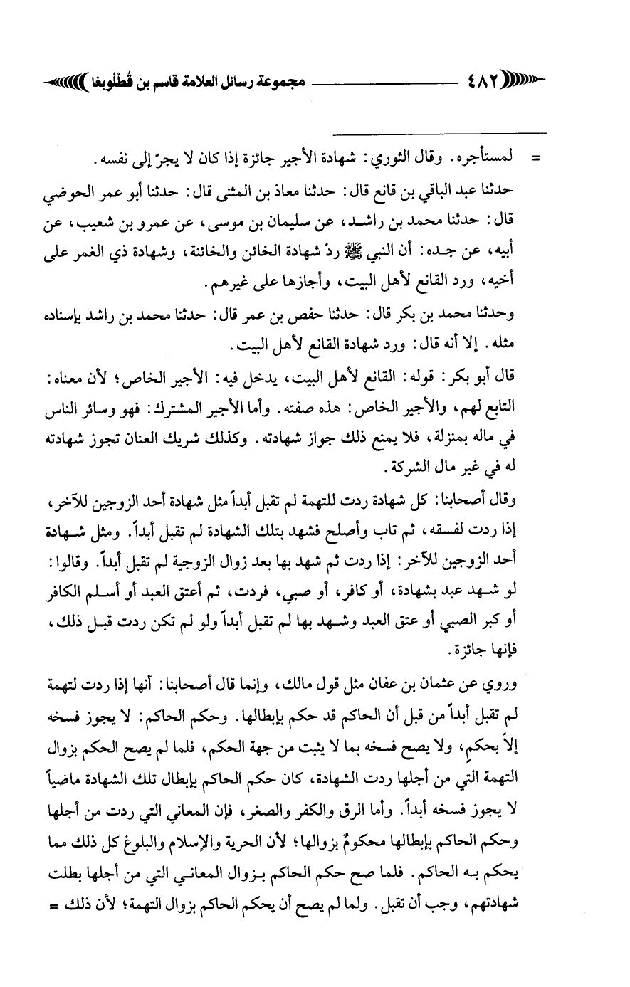 وروي عن عثمان بن عفان مثل قول مالك، وإنما قال أصحابنا: أنها إذا ردت لتهمة لم تقبل أبدًا من قبل أن الحاكم قد حكم بإبطالها. وحكم الحاكم: لا يجوز فسخه إلاّ بحكمٍ، ولا يصح فسخه بما لا يثبت من جهة الحكم، فلما لم يصح الحكم بزوال التهمة التي من أجلها ردت الشهادة، كان حكم الحاكم بإبطال تلك الشهادة ماضيًا لا يجوز فسخه أبدًا. وأما الرق والكفر والصغر، فإن المعاني التي ردت من أجلها وحكم الحاكم بإبطالها محكومٌ بزوالها؛ لأن الحرية والإسلام والبلوغ كل ذلك مما يحكم به الحاكم. فلما صح حكم الحاكم بزوال المعاني التي من أجلها بطلت شهادتهم، وجب أن تقبل. ولما لم يصح أن يحكم الحاكم بزوال التهمة؛ لأن ذلك=
