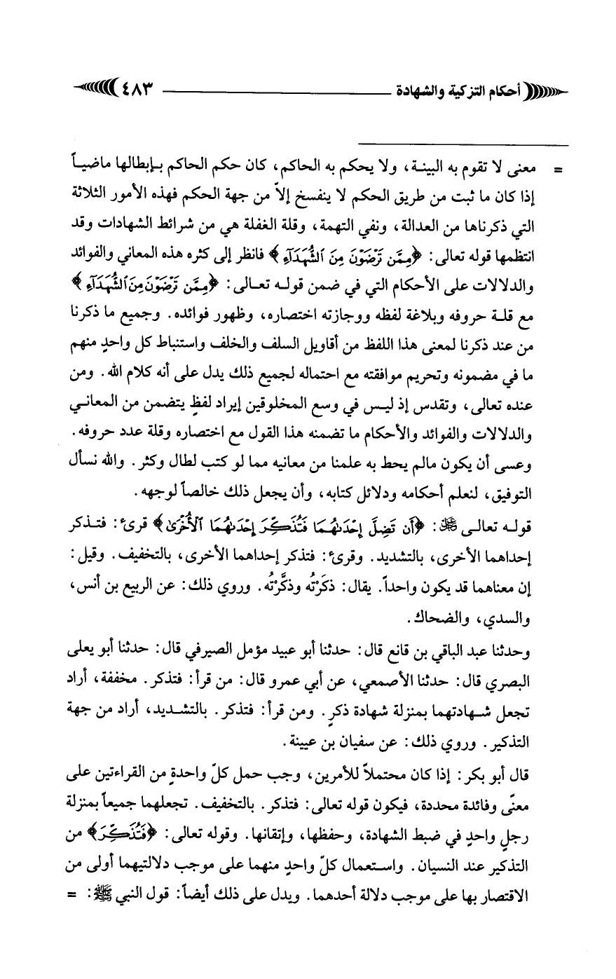 = معنى لا تقوم به البينة، ولا يحكم به الحاكم، كان حكم الحاكم بإبطالها ماضيًا إذا كان ما ثبت من طريق الحكم لا ينفسخ إلاّ من جهة الحكم فهذه الأمور الثلاثة التي ذكرناها من العدالة، ونفي التهمة، وقلة الغفلة هي من شرائط الشهادات وقد انتظمها قوله تعالى: {مِمَّنْ تَرْضَوْنَ مِنَ الشُّهَدَاءِ} [البقرة: 282] فانظر إلى كثره هذه المعاني والفوائد والدلالات على الأحكام التي في ضمن قوله تعالى: {مِمَّنْ تَرْضَوْنَ مِنَ الشُّهَدَاءِ} [البقرة: 282] مع قلة حروفه وبلاغة لفظه ووجازته اختصاره، وظهور فوائده. وجميع ما ذكرنا من عند ذكرنا لمعنى هذا اللفظ من أقاويل السلف والخلف واستنباط كل واحدٍ منهم ما في مضمونه وتحريم موافقته مع احتماله لجميع ذلك يدل على أنه كلام الله. ومن عنده تعالى، وتقدس إذ ليس في وسع المخلوقين إيراد لفظٍ يتضمن من المعاني والدلالات والفوائد والأحكام ما تضمنه هذا القول مع اختصاره وقلة عدد حروفه. وعسى أن يكون ما لم يحط به علمنا من معانيه مما لو كتب لطال وكثر. والله نسأل التوفيق، لنعلم أحكامه ودلائل كتابه، وأن يجعل ذلك خالصًا لوجهه.