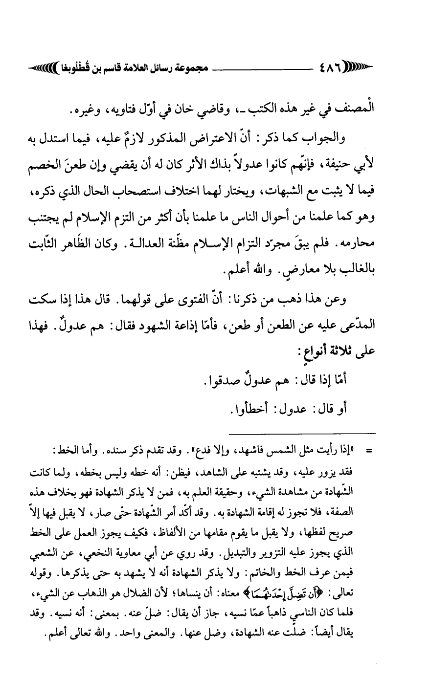 وعن هذا ذهب من ذكرنا: أنّ الفتوى على قولهما. قال هذا إذا سكت المدّعى عليه عن الطعن أو طعن، فأمّا إذاعة الشهود فقال: هم عدولٌ. فهذا على ثلاثة أنواعٍ: