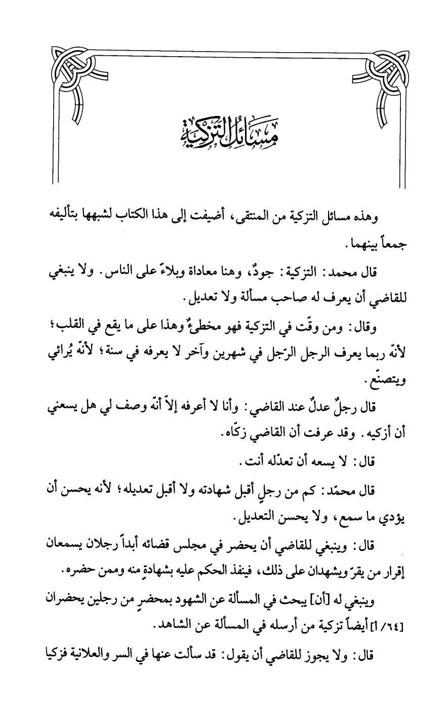 وهذه مسائل التزكية من المنتقى، أضيفت إلى هذا الكتاب لشبهها بتأليفه جمعًا بينهما.