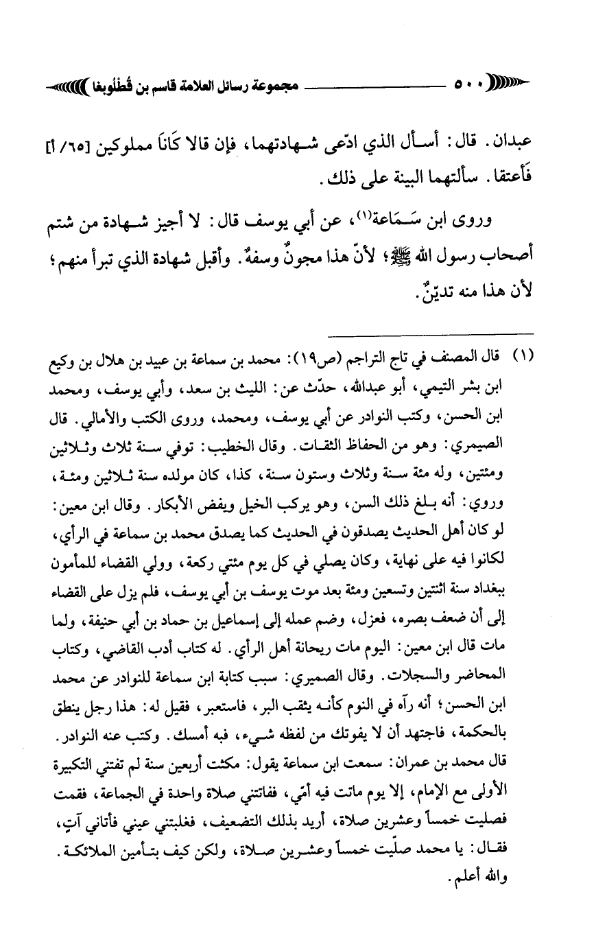 (¬1) قال المصنف في تاج التراجم (ص 19): محمد بن سماعة بن عبيد بن هلال بن وكيع ابن بشر التيمي، أبو عبد الله، حدّث عن: الليث بن سعد، وأبي يوسف، ومحمد ابن الحسن، وكتب النوادر عن أبي يوسف، ومحمد، وروى الكتب والأمالي. قال الصيمري: وهو من الحفاظ الثقات. وقال الخطيب: توفي سنة ثلاث وثلاثين ومئتين، وله مئة سنة وثلاث وستون سنة، كذا، كان مولده سنة ثلاثين ومئة، وروي: أنه بلغ ذلك السن، وهو يركب الخيل ويفض الأبكار. وقال ابن معين: لو كان أهل الحديث يصدقون في الحديث كما يصدق محمد بن سماعة في الرأي، لكانوا فيه على نهاية، وكان يصلي في كل يوم مئتي ركعة، وولي القضاء للمأمون ببغداد سنة اثنتين وتسعين ومئة بعد موت يوسف بن أبي يوسف، فلم يزل على القضاء إلى أن ضعف بصره، فعزل، وضم عمله إلى إسماعيل بن حماد بن أبي حنيفة، ولما مات قال ابن معين: اليوم مات ريحانة أهل الرأي. له كتاب أدب القاضي، وكتاب المحاضر والسجلات. وقال الصميري: سبب كتابة ابن سماعة للنوادر عن محمد ابن الحسن؛ أنه رآه في النوم كأنه يثقب البر، فاستعبر، فقيل له: هذا رجل ينطق بالحكمة، فاجتهد أن لا يفوتك من لفظه شيء، فبه أمسك. وكتب عنه النوادر. قال محمد بن عمران: سمعت ابن سماعة يقول: مكثت أربعين سنة لم تفتني التكبيرة الأولى مع الإمام، إلا يوم ماتت فيه أني، ففاتتني صلاة واحدة في الجماعة، فقمت فصليت خمسًا وعشرين صلاة، أريد بذلك التضعيف، فغلبتني عيني فأتاني آتٍ، فقال: يا محمد صليت خمسًا وعشرين صلاة، ولكن كيف بتأمين الملائكة. والله أعلم.