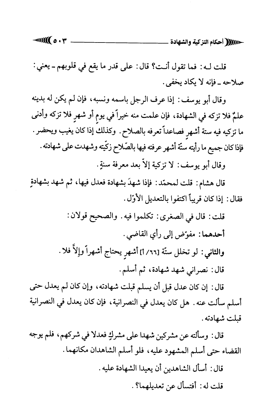 وقال أبو يوسف: إذا عرف الرجل باسمه ونسبه، فإن لم يكن له بدينه علمٌ فلا تزكه في الشهادة، فإن علمت منه خيرًا في يومٍ أو شهرٍ فلا تزكه وأدنى ما تزكيه فيه ستة أشهرٍ فصاعدًا تعرفه بالصلاح. وكذلك إذا كان يغيب ويحضر. فإذا كان جميع ما رأيته ستّة أشهر عرفته فيها بالصّلاح زكّيته وشهدت على شهادته.