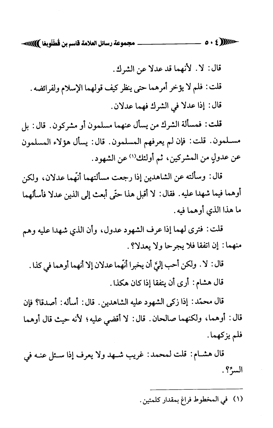 قلت: فمسألة الشرك من يسأل عنهما مسلمون أو مشركون. قال: بل مسلمون. قلت: فإن لم يعرفهم المسلمون. قال: يسأل هؤلاء المسلمون عن عدولٍ من المشركين، ثم أولئك (¬1) عن الشهود.