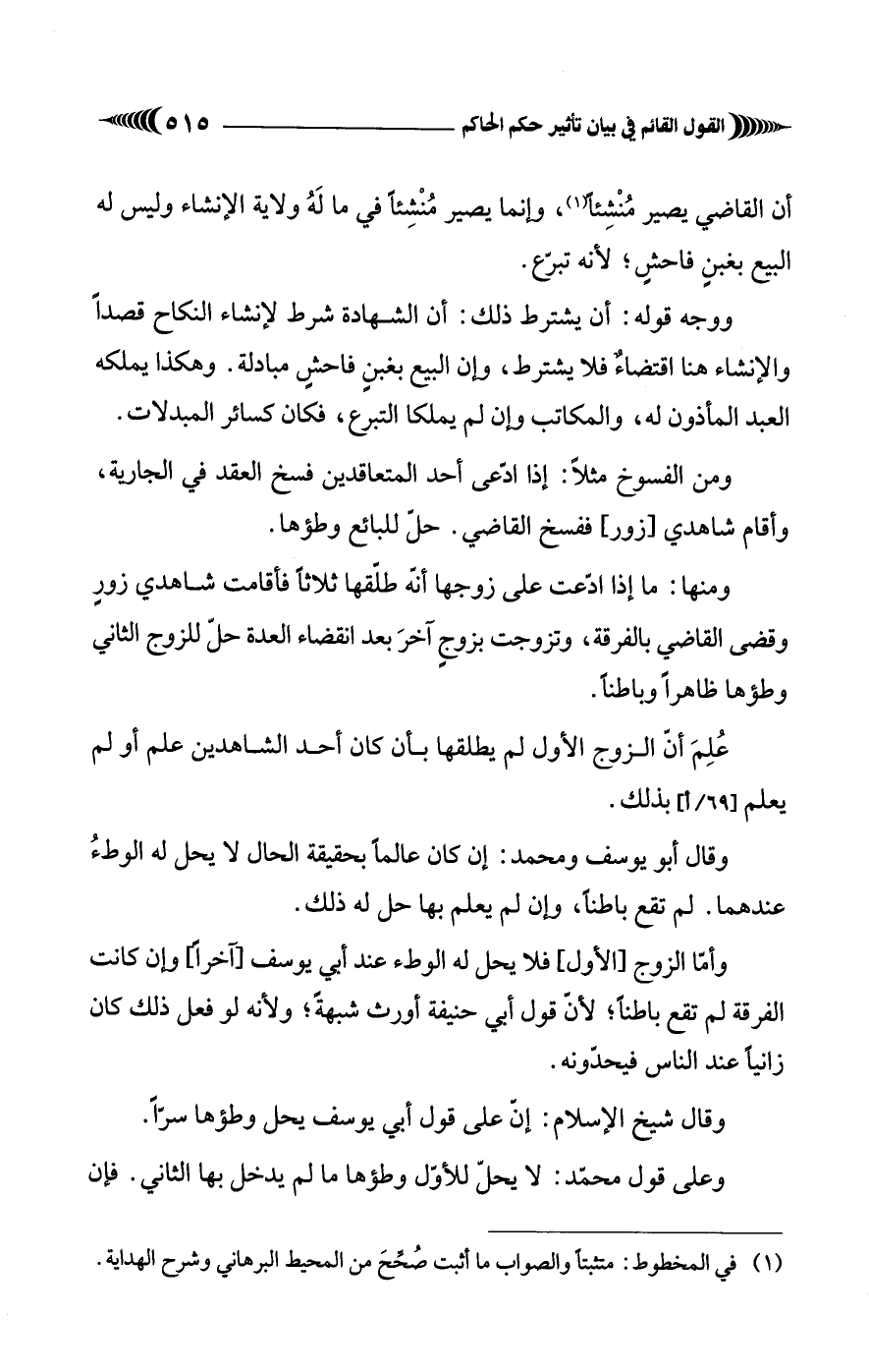 ومن الفسوخ مثلًا: إذا ادّعى أحد المتعاقدين فسخ العقد في الجارية، وأقام شاهدي [زور] ففسخ القاضي. حلّ للبائع وطؤها.