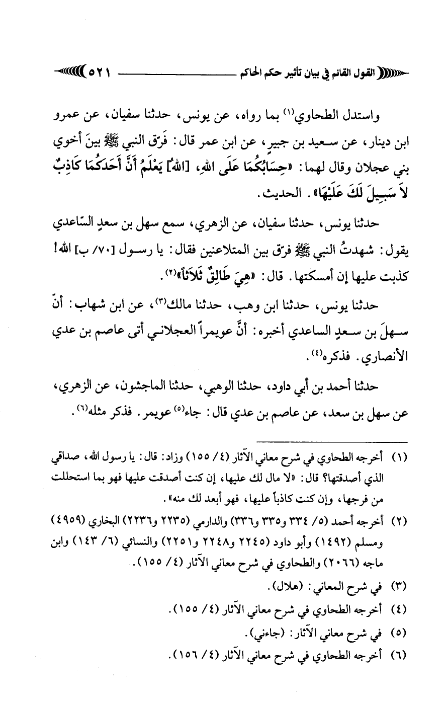 واستدل الطحاوي (¬1) بما رواه، عن يونس، حدثنا سفيان، عن عمرو ابن دينار، عن سعيد بن جبيرٍ، عن ابن عمر قال: فَرّق النبي - صلى الله عليه وسلم - بينَ أخوي بني عجلان وقال لهما: "حِسَابُكُمَا عَلَى اللهِ، [الله] يَعْلَمُ أَنَّ أَحَدَكُمَا كَاذِبٌ لاَ سَبِيلَ لَكَ عَلَيْهَا". الحديث.