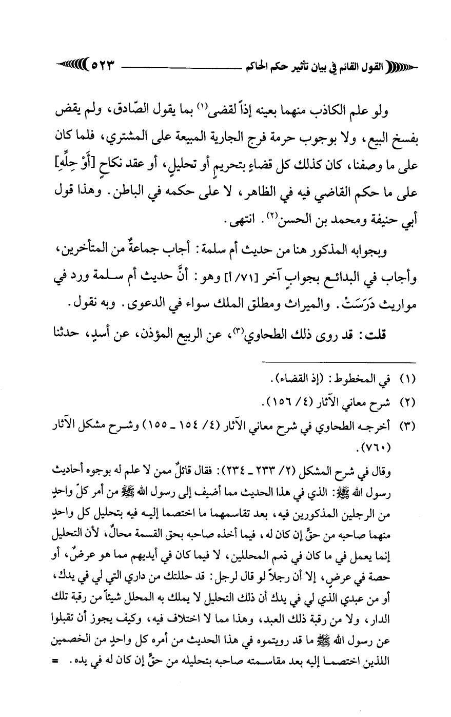 (¬3) أخرجه الطحاوي في شرح معاني الآثار (4/ 154 - 155) وشرح مشكل الآثار وقال في شرح المشكل (2/ 233 - 234): فقال قائلٌ ممن لا علم له بوجوه أحاديث رسول الله - صلى الله عليه وسلم -: الذي في هذا الحديث مما أضيف إلى رسول الله - صلى الله عليه وسلم - من أمر كلّ واحدٍ من الرجلين المذكورين فيه، بعد تقاسمهما ما اختصما إليه فيه بتحليل كل واحدٍ منهما صاحبه من حقٍّ إن كان له، فيما أخذه صاحبه بحق القسمة محالٌ؛ لأن التحليل إنما يعمل في ما كان في ذمم المحللين، لا فيما كان في أيديهم مما هو عرضٌ، أو حصة في عرضٍ، إلا أن رجلًا لو قال لرجل: قد حللتك من داري التي لي في يدك، أو من عبدي الذي لي في يدك أن ذلك التحليل لا يملك به المحلل شيئًا من رقبة تلك الدار، ولا من رقبة ذلك العبد، وهذا مما لا اختلاف فيه، وكيف يجوز أن تقبلوا عن رسول الله - صلى الله عليه وسلم - ما قد رويتموه في هذا الحديث من أمره كل واحدٍ من الخصمين اللذين اختصما إليه بعد مقاسمته صاحبه بتحليله من حقٍّ إن كان له في يده. =