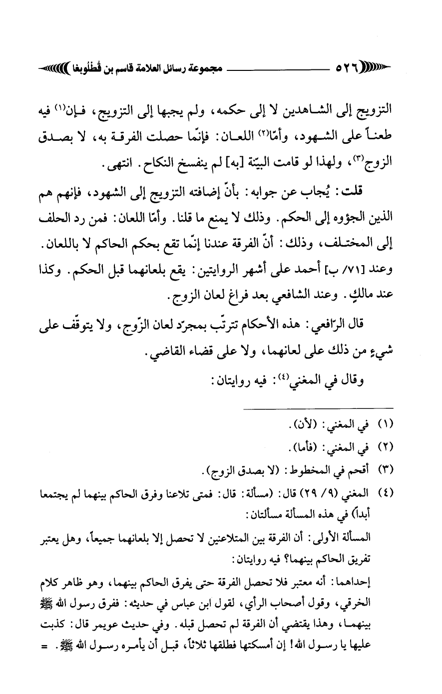 (¬4) المغني (9/ 29) قال: (مسألة: قال: فمتى تلاعنا وفرق الحاكم بينهما لم يجتمعا أبدًا) في هذه المسألة مسألتان: