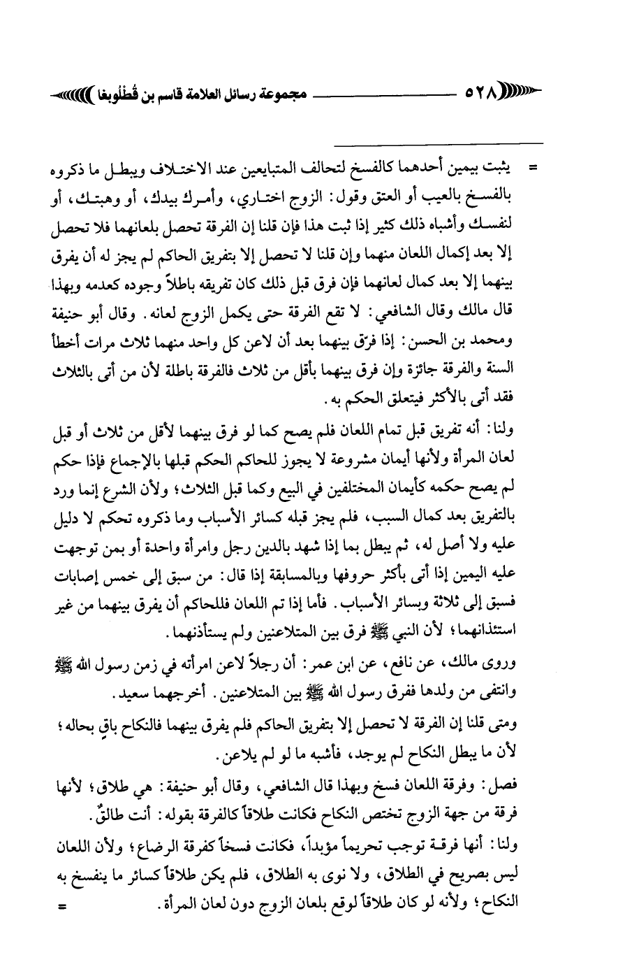 = يثبت بيمين أحدهما كالفسخ لتحالف المتبايعين عند الاختلاف ويبطل ما ذكروه بالفسخ بالعيب أو العتق وقول: الزوج اختاري، وأمرك بيدك، أو وهبتك، أو لنفسك وأشباه ذلك كثير إذا ثبت هذا فإن قلنا إن الفرقة تحصل بلعانهما فلا تحصل إلا بعد إكمال اللعان منهما وإن قلنا لا تحصل إلا بتفريق الحاكم لم يجز له أن يفرق بينهما إلا بعد كمال لعانهما فإن فرق قبل ذلك كان تفريقه باطلًا وجوده كعدمه وبهذا قال مالك وقال الشافعي: لا تقع الفرقة حتى يكمل الزوج لعانه. وقال أبو حنيفة ومحمد بن الحسن: إذا فرّق بينهما بعد أن لاعن كل واحد منهما ثلاث مرات أخطأ السنة والفرقة جائزة وإن فرق بينهما بأقل من ثلاث فالفرقة باطلة لأن من أتى بالثلاث فقد أتى بأكثر فيتعلق الحكم به.