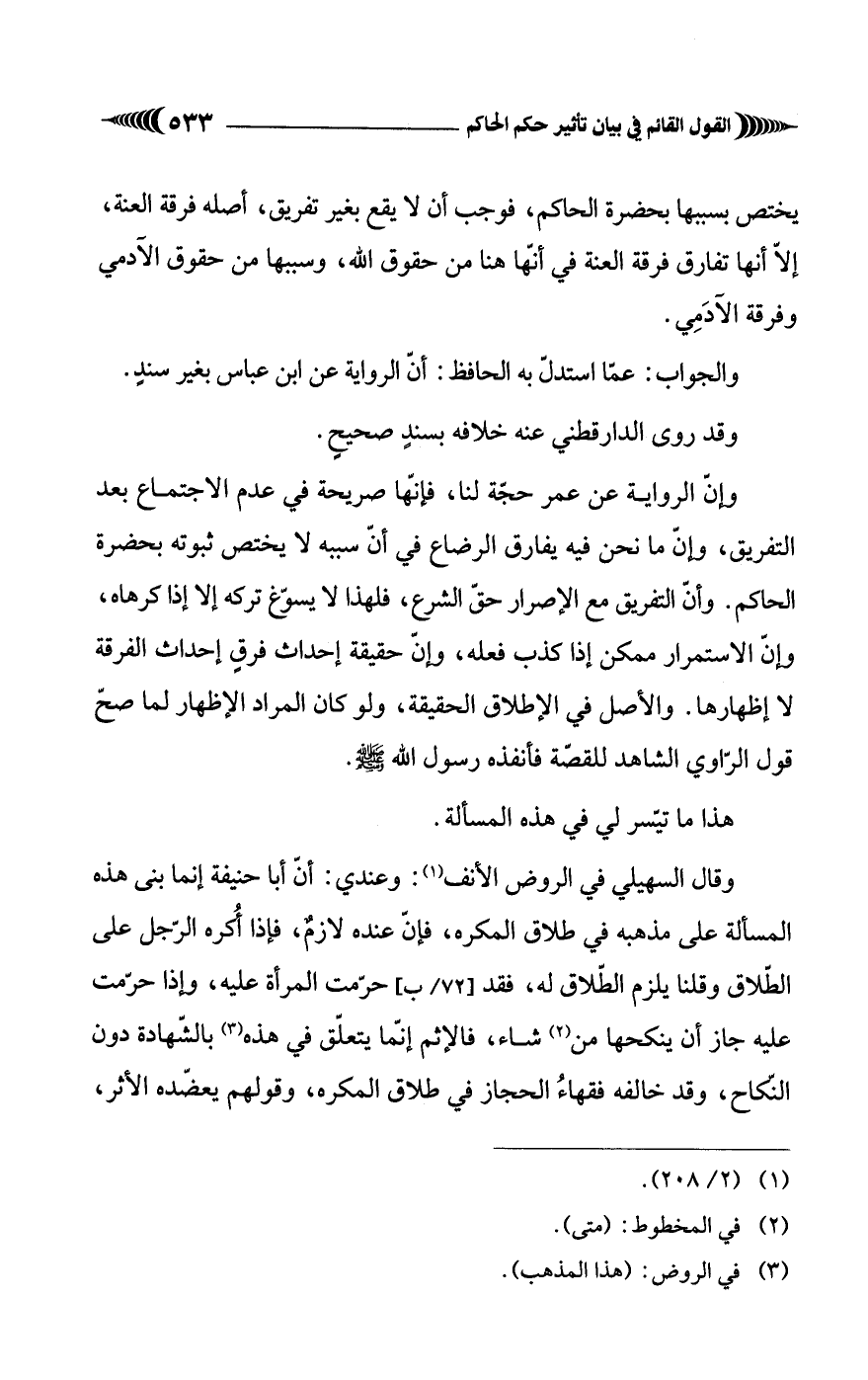 وقال السهيلي في الروض الأنف (¬1): وعندي: أنّ أبا حنيفة إنما بنى هذه المسألة على مذهبه في طلاق المكره، فإنّ عنده لازمٌ، فإذا أكُره الرّجل على الطّلاق وقلنا يلزم الطّلاق له، فقد حرّمت المرأة عليه، وإذا حرّمت عليه جاز أن ينكحها من (¬2) شاء، فالإثم إنّما يتعلّق في هذه (¬3) بالشهادة دون النكاح، وقد خالفه فقهاءُ الحجاز في طلاق المكره، وقولهم يعضّده الأثر،