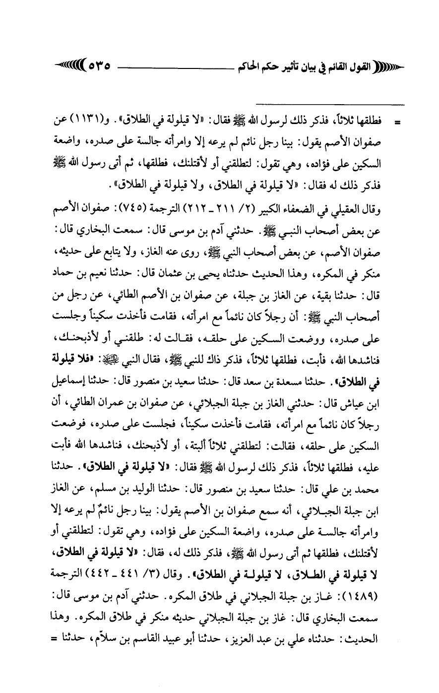 وقال العقيلي في الضعفاء الكبير (2/ 211 - 212) الترجمة (745): صفوان الأصم عن بعض أصحاب النبي - صلى الله عليه وسلم -. حدثني آدم بن موسى قال: سمعت البخاري قال: صفوان الأصم، عن بعض أصحاب النبي - صلى الله عليه وسلم -، روى عنه الغاز، ولا يتابع على حديثه، منكر في المكره، وهذا الحديث حدثناه يحيى بن عثمان قال: حدثنا نعيم بن حماد قال: حدثنا بقية، عن الغاز بن جبلة، عن صفوان بن الأصم الطائي، عن رجل من أصحاب النبي - صلى الله عليه وسلم -: أن رجلًا كان نائمًا مع امرأته، فقامت فأخذت سكينًا وجلست على صدره، ووضعت السكين على حلقه، فقالت له: طلقني أو لأذبحنك، فناشدها الله، فأبت، فطلقها ثلاثًا، فذكر ذاك للنبي - صلى الله عليه وسلم -، فقال النبي - صلى الله عليه وسلم -: "فلا قيلولة في الطلاق". حدثنا مسعدة بن سعد قال: حدثنا سعيد بن منصور قال: حدثنا إسماعيل ابن عياش قال: حدثني الغاز بن جبلة الجبلائي، عن صفوان بن عمران الطائي، أن رجلًا كان نائمًا مع امرأته، فقامت فأخذت سكينًا، فجلست على صدره، فوضعت السكين على حلقه، فقالت: لتطلقني ثلاثًا ألبتة، أو لأذبحنك، فناشدها الله فأبت عليه، فطلقها ثلاثًا، فذكر ذلك لرسول الله - صلى الله عليه وسلم - فقال: "لا قيلولة في الطلاق". حدثنا محمد بن علي قال: حدثنا سعيد بن منصور قال: حدثنا الوليد بن مسلم، عن الغاز ابن جبلة الجبلائي، أنه سمع صفوان بن الأصم يقول: بينا رجل نائمٌ لم يرعه إلا وامرأته جالسة على صدره، واضعة السكين على فؤاده، وهي تقول: لتطلقني أو لأقتلنك، فطلقها ثم أتى رسول الله - صلى الله عليه وسلم -، فذكر ذلك له، فقال: "لا قيلولة في الطلاق، لا قيلولة في الطلاق، لا قيلولة في الطلاق". وقال (3/ 441 - 442) الترجمة (1489): غاز بن جبلة الجبلاني في طلاق المكره. حدثني آدم بن موسى قال: سمعت البخاري قال: غاز بن جبلة الجبلاني حديثه منكر في طلاق المكره. وهذا الحديث: حدثناه علي بن عبد العزيز، حدثنا أبو عبيد القاسم بن سلاّم، حدثنا =