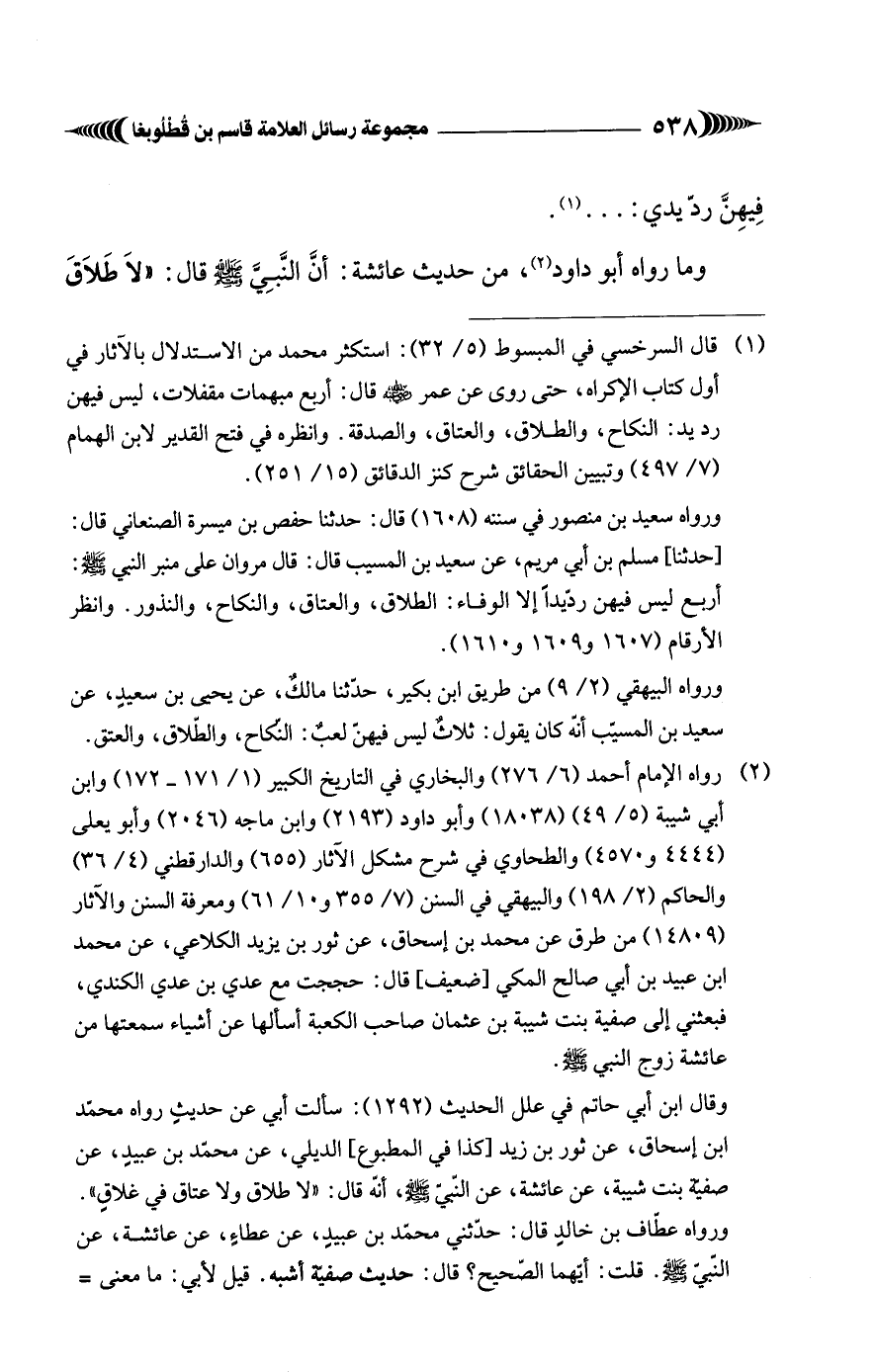 وما رواه أبو داود (¬2)، من حديث عائشة: أنَّ النَّبِيَّ - صلى الله عليه وسلم - قال: "لاَ طَلاَقَ