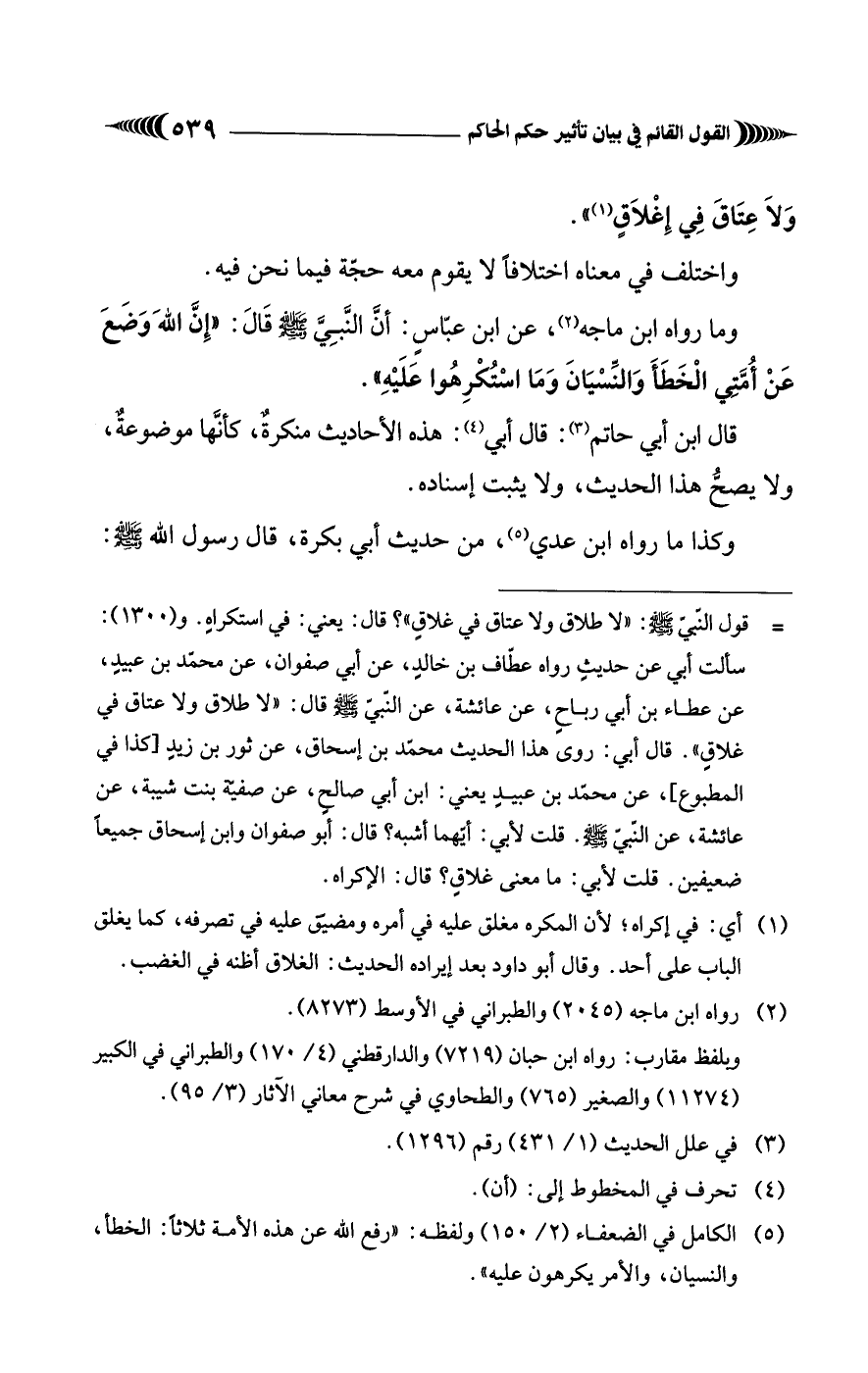 (¬5) الكامل في الضعفاء (2/ 150) ولفظه: "رفع الله عن هذه الأمة ثلاثًا: الخطأ، والنسيان، والأمر يكرهون عليه".
