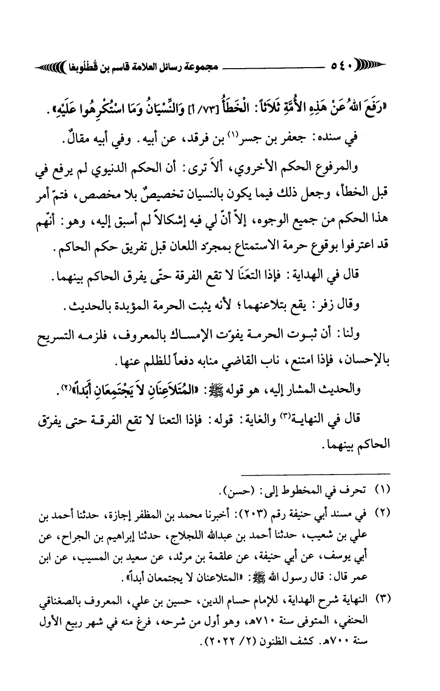 (¬2) في مسند أبي حنيفة رقم (203): أخبرنا محمد بن المظفر إجازة، حدثنا أحمد بن علي بن شعيب، حدثنا أحمد بن عبد الله اللجلاج، حدثنا إبراهيم بن الجراح، عن أبي يوسف، عن أبي حنيفة، عن علقمة بن مرثد، عن سعيد بن المسيب، عن ابن عمر قال: قال رسول الله - صلى الله عليه وسلم -: "المتلاعنان لا يجتمعان أبدًا".