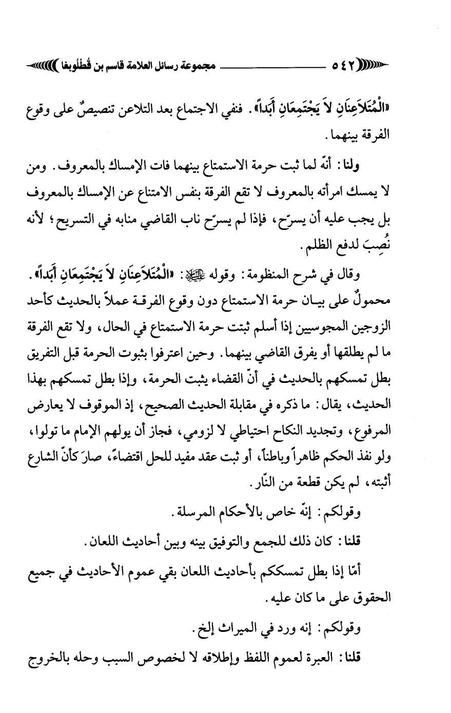 وقال في شرح المنظومة: وقوله - عليه السلام -: "الْمُتَلاَعِنَانِ لاَ يَجْتَمِعَانِ أَبَدًا". محمولٌ على بيان حرمة الاستمتاع دون وقوع الفرقة عملًا بالحديث كأحد الزوجين المجوسيين إذا أسلم ثبتت حرمة الاستمتاع في الحال، ولا تقع الفرقة ما لم يطلقها أو يفرق القاضي بينهما. وحين اعترفوا بثبوت الحرمة قبل التفريق بطل تمسكهم بالحديث في أنّ القضاء يثبت الحرمة، وإذا بطل تمسكهم بهذا الحديث، يقال: ما ذكره في مقابلة الحديث الصحيح، إذ الموقوف لا يعارض المرفوع، وتجديد النكاح احتياطي لا لزومي، فجاز أن يولهم الإمام ما تولوا، ولو نفذ الحكم ظاهرًا وباطنًا، أو ثبت عقد مفيد للحل اقتضاءً، صارَ كأنّ الشارع أثبته، لم يكن قطعة من النّار.