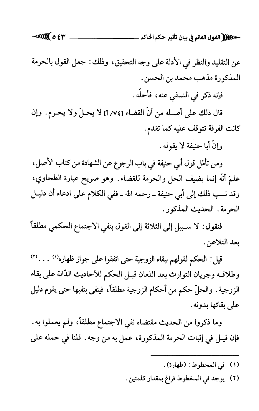 ومن تأمّل قول أبي حنيفة في باب الرجوع عن الشهادة من كتاب الأصل، علمَ أنّه إنما يضيف الحل والحرمة للقضاء. وهو صريح عبارة الطحاوي، وقد نسب ذلك إلى أبي حنيفة - رحمه الله - ففي الكلام على ادعاء أن دليل الحرمة. الحديث المذكور.