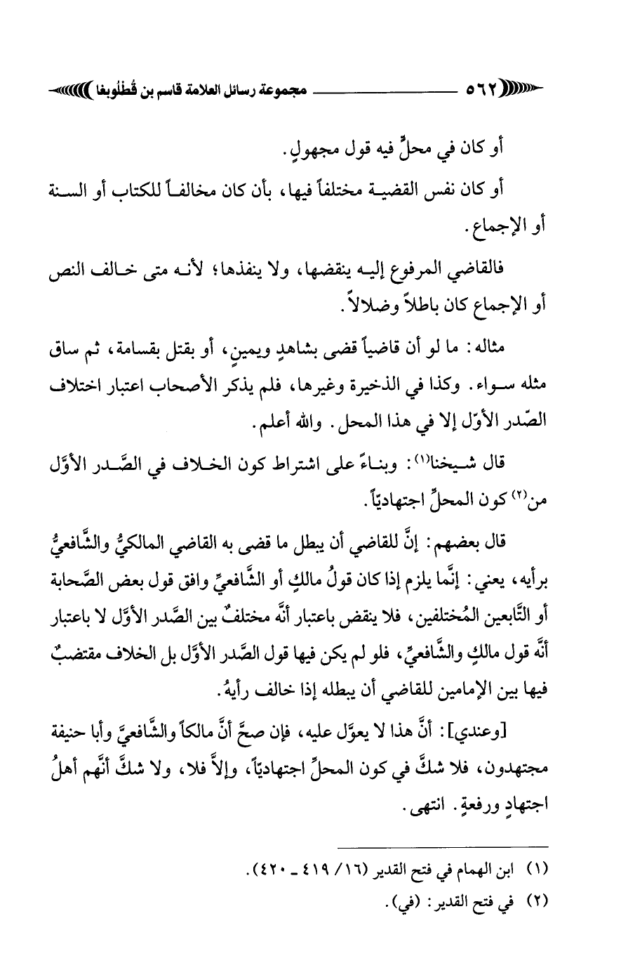 قال بعضهم: إنَّ للقاضي أن يبطل ما قضى به القاضي المالكيُّ والشَّافعيُّ برأيه، يعني: إنَّما يلزم إذا كان قولُ مالكٍ أو الشَّافعيِّ وافق قول بعض الصَّحابة أو التَّابعين المُختلفين، فلا ينقض باعتبار أنَّه مختلفٌ بين الصَّدر الأوَّل لا باعتبار أنَّه قول مالكٍ والشَّافعيِّ، فلو لم يكن فيها قول الصَّدر الأوَّل بل الخلاف مقتضبٌ فيها بين الإمامين للقاضي أن يبطله إذا خالف رأيهُ.