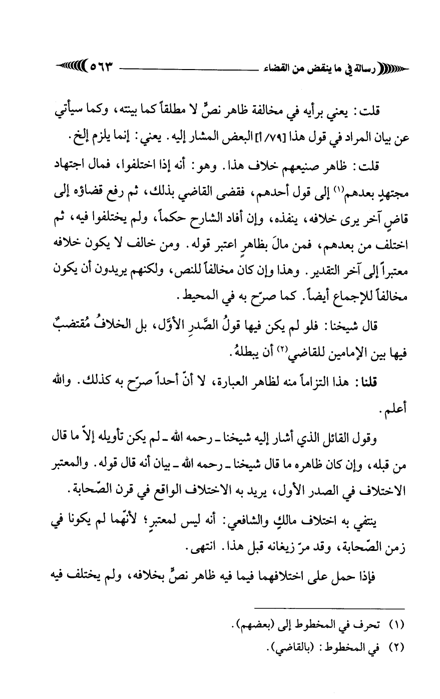 قلت: ظاهر صنيعهم خلاف هذا. وهو: أنه إذا اختلفوا، فمال اجتهاد مجتهدٍ بعدهم (¬1) إلى قول أحدهم، فقضى القاضي بذلك، ثم رفع قضاؤه إلى قاضٍ آخر يرى خلافه، ينفذه، كان أفاد الشارح حكماً، ولم يختلفوا فيه، ثم اختلف من بعدهم، فمن مالَ بظاهرٍ اعتبر قوله. ومن خالف لا يكون خلافه معتبراً إلى آخر التقدير. وهذا وإن كان مخالفاً للنص، ولكنهم يريدون أن يكون مخالفاً للإجماع أيضاً. كما صرّح به في المحيط.